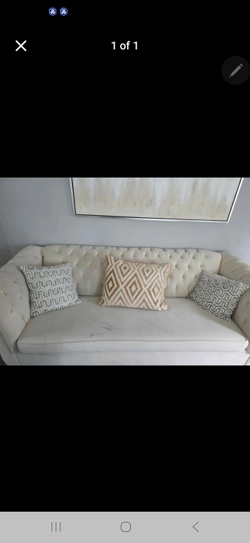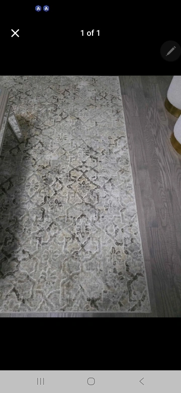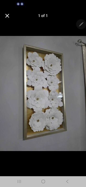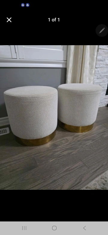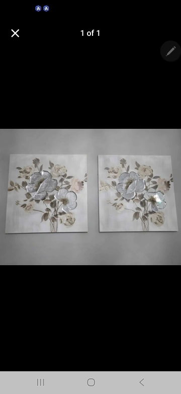Selling various pieces of home decor wall art. There is a framed floral piece, a set of two floral art pieces, a rug, a silver and white wall art piece, and a pair of white and gold stools. All in great condition!