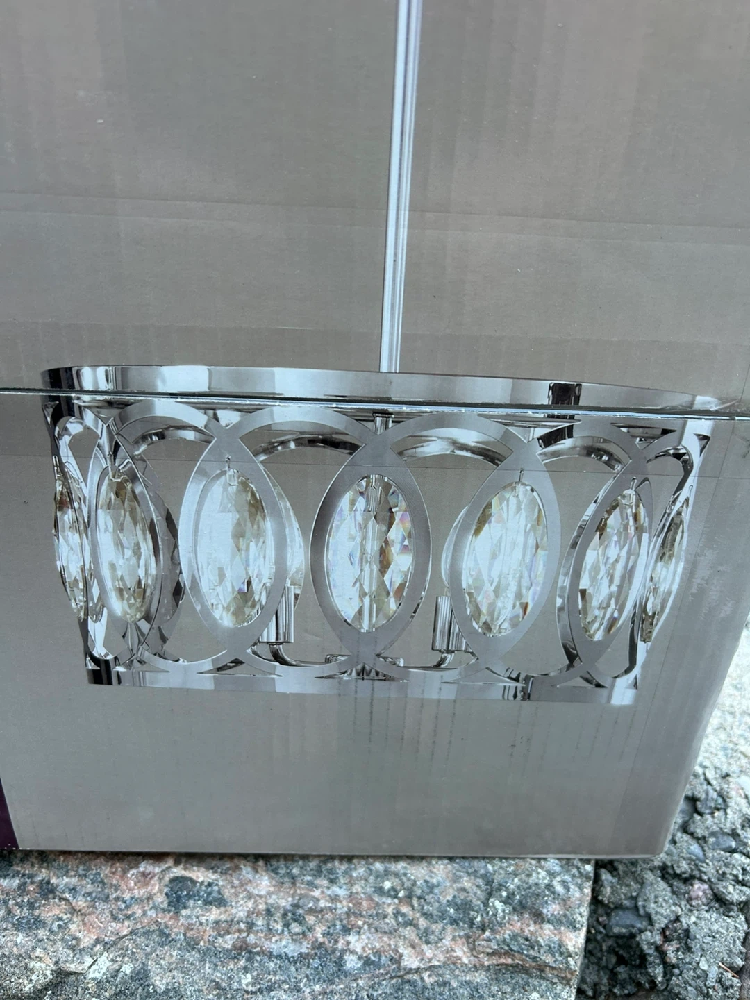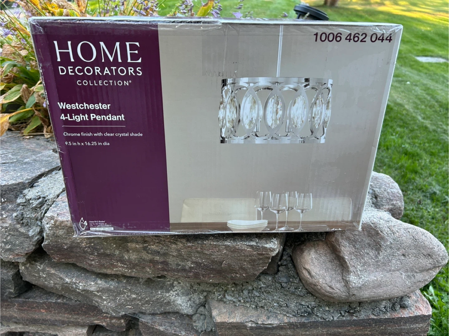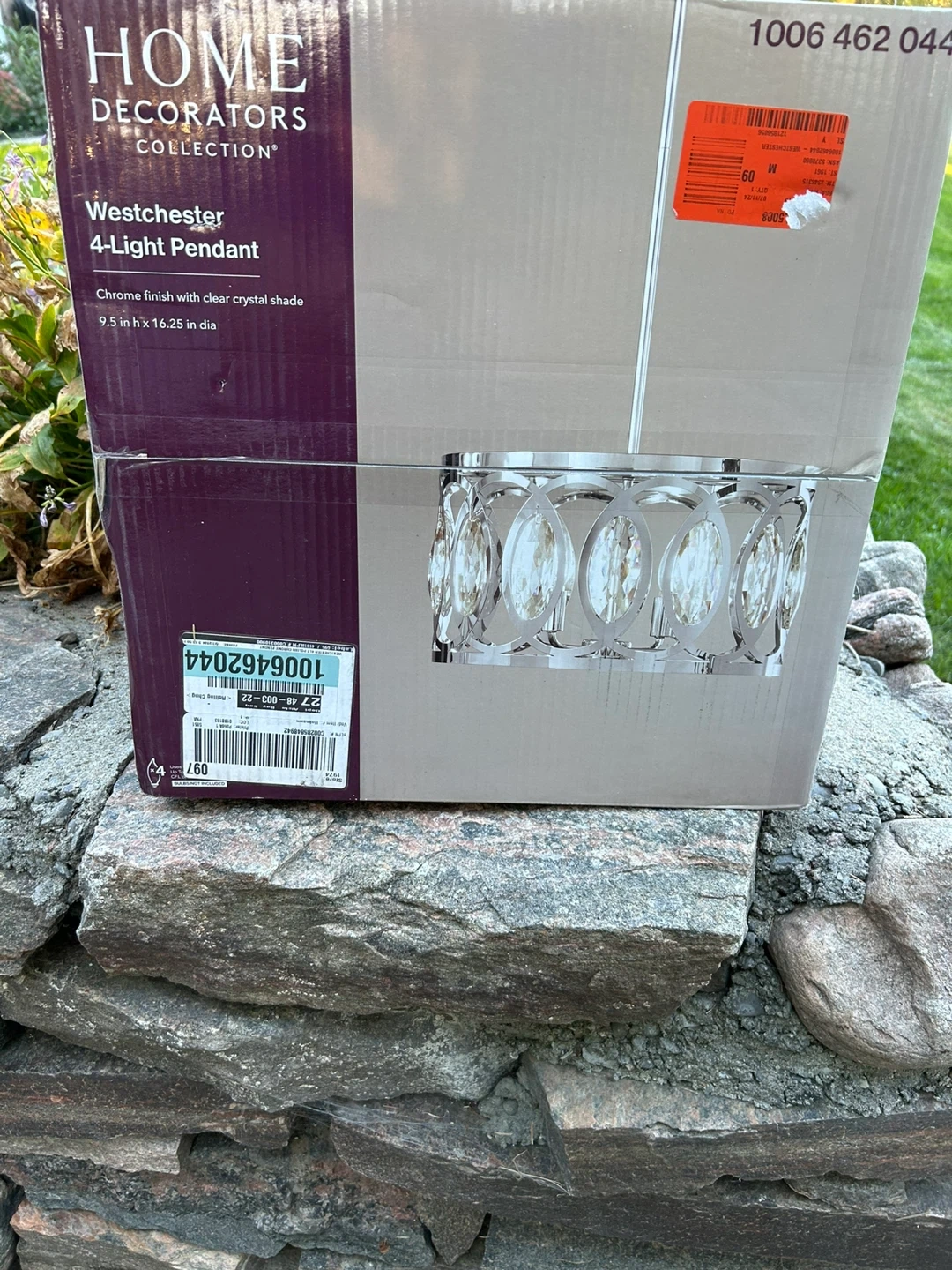 Selling a Home Decorators Collection Westchester 4-Light Pendant. It's brand new in the box! The pendant has a chrome finish with a clear crystal shade. Dimensions are 9.5 inches in height and 16.25 inches in diameter