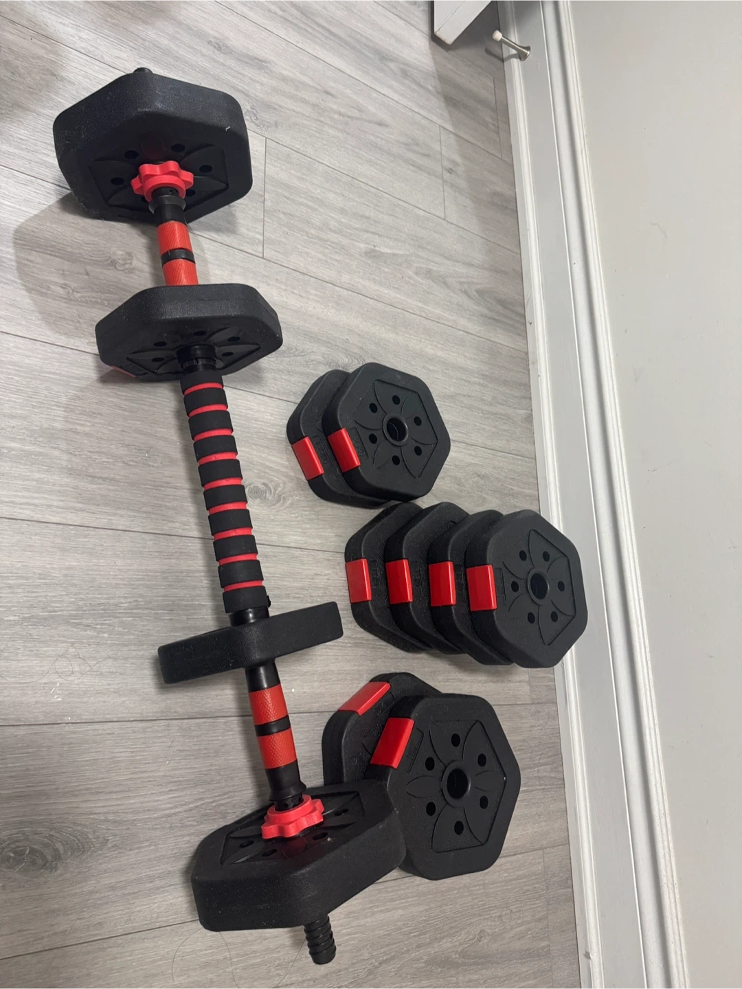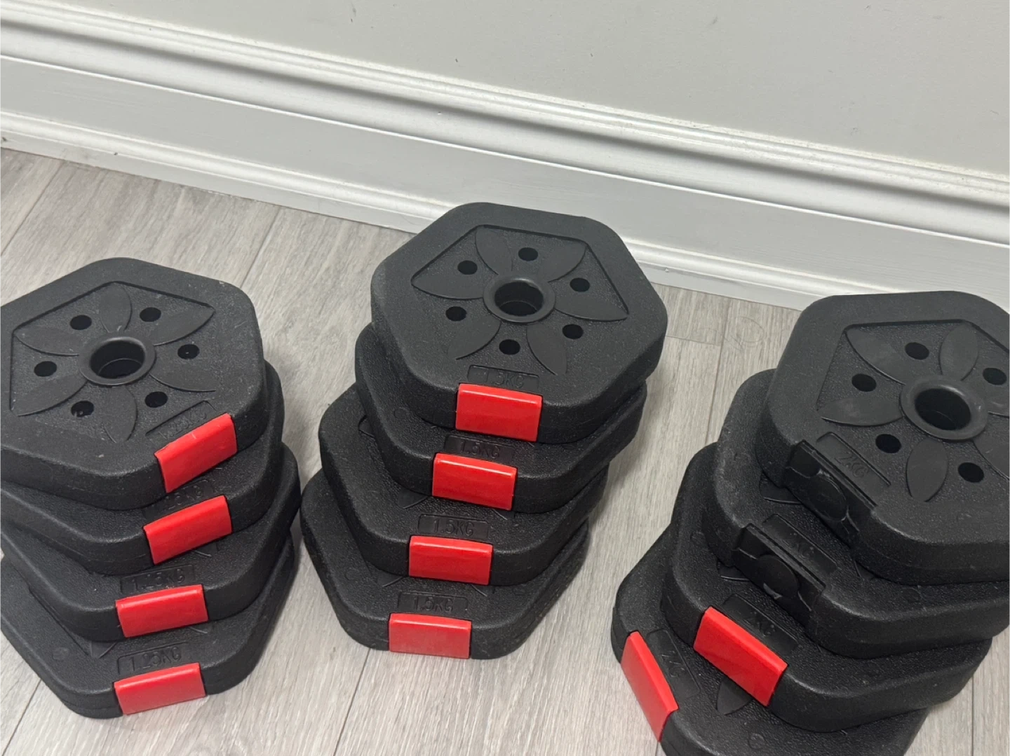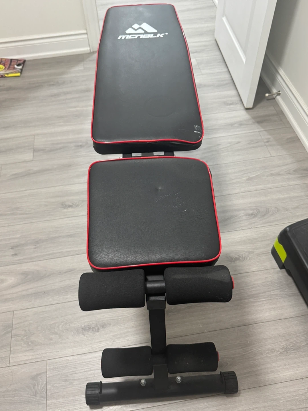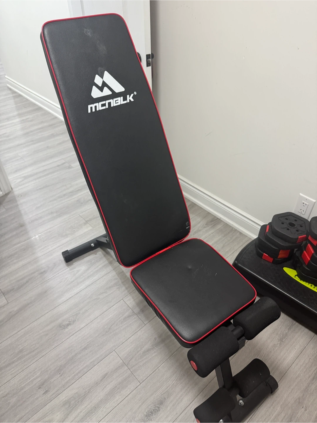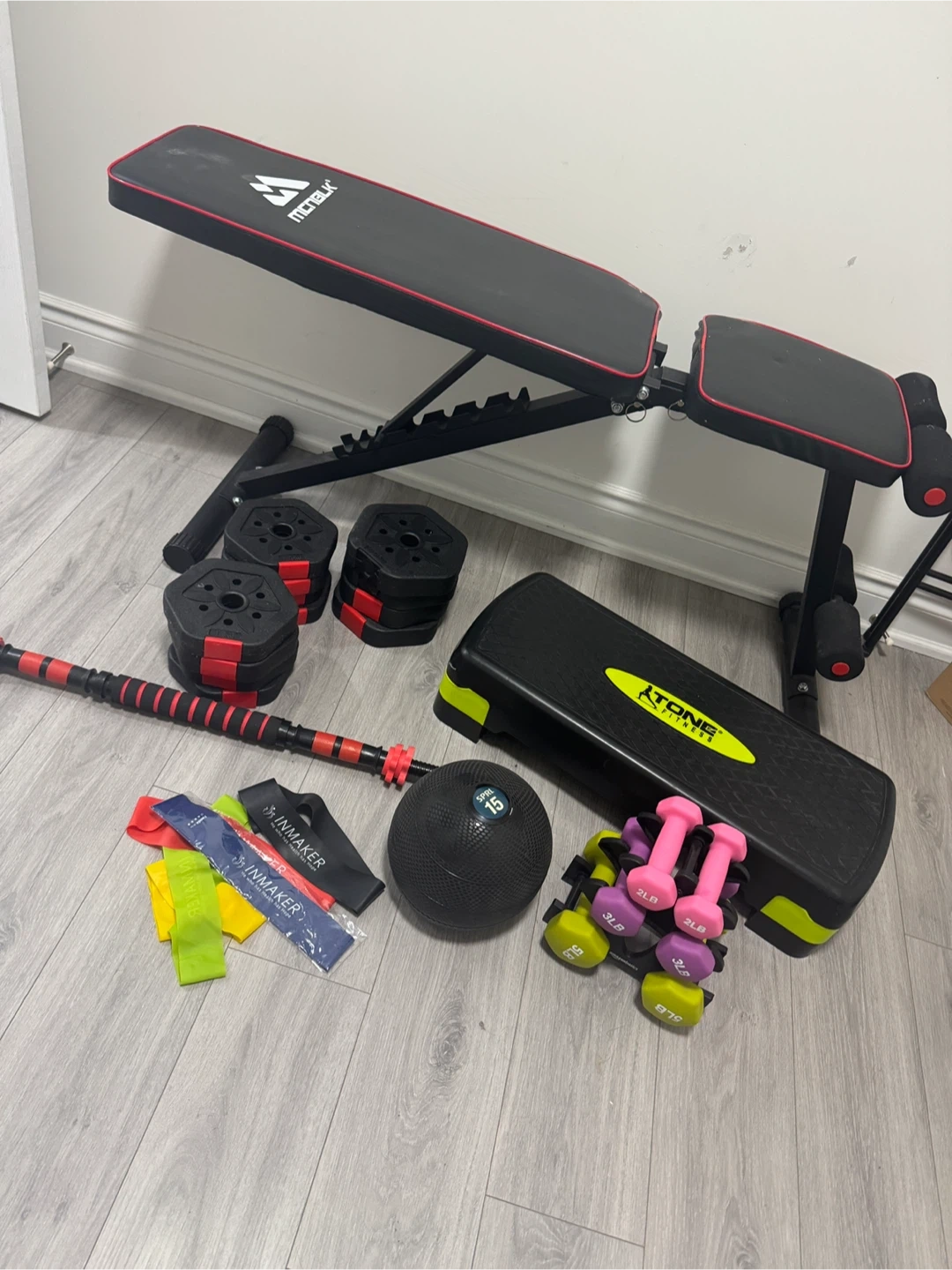 Get everything you need for a home workout! This set includes resistance bands, a step platform (Tone Fitness brand), a weight bench (McBLK), a slam ball, dumbbells, and weights. Perfect for building strength and staying active at home Total set $150 Only bench : $80 Dumb bell set : $25 Dumb bell with bar : $25 Step up box : $20 Slam ball : $20 Weight bands - for free if you buy the whole set together Everything is in good condition Only Pick up available Caledon, 5 min away from Kennedy rd and Mayfield road intersection
