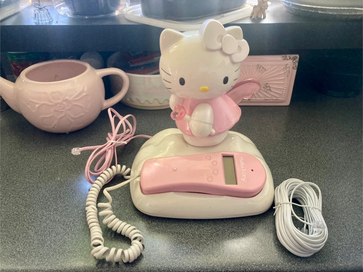 Hello Kitty landline flash telephone . Wing & wound light up when phone rings . Takes 4 C alkaline batteries. Vintage 2003. Brand new extra long phone cord included , to reach other side of room if needed . Red light lights up on hand held phone & phone number is displayed as well. From a smoke free home . $50 FIRM Pick up only , in Woodstock. No delivery. No holds . Cash only