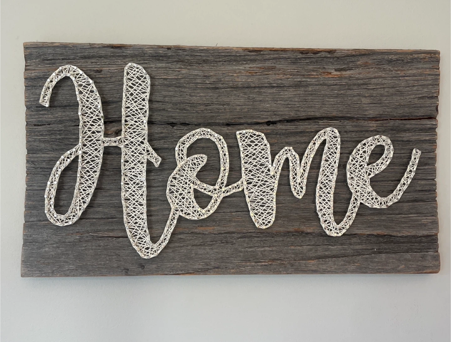 Rustic "Home" string art on a weathered wood background. It's a charming piece to add a cozy touch to any room Pick up in Whitby near Rossland & Bassett Cash only