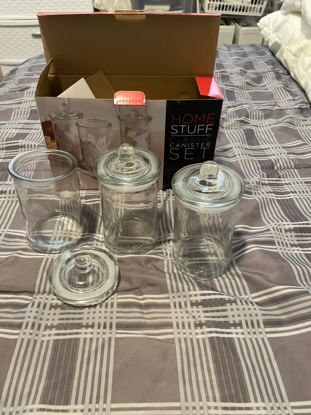 Selling a brand new Home Stuff Classic Canister Set, which includes 3 glass canisters! These are perfect for storing various items in your kitchen, pantry, or bathroom. The set comes with the original box.
