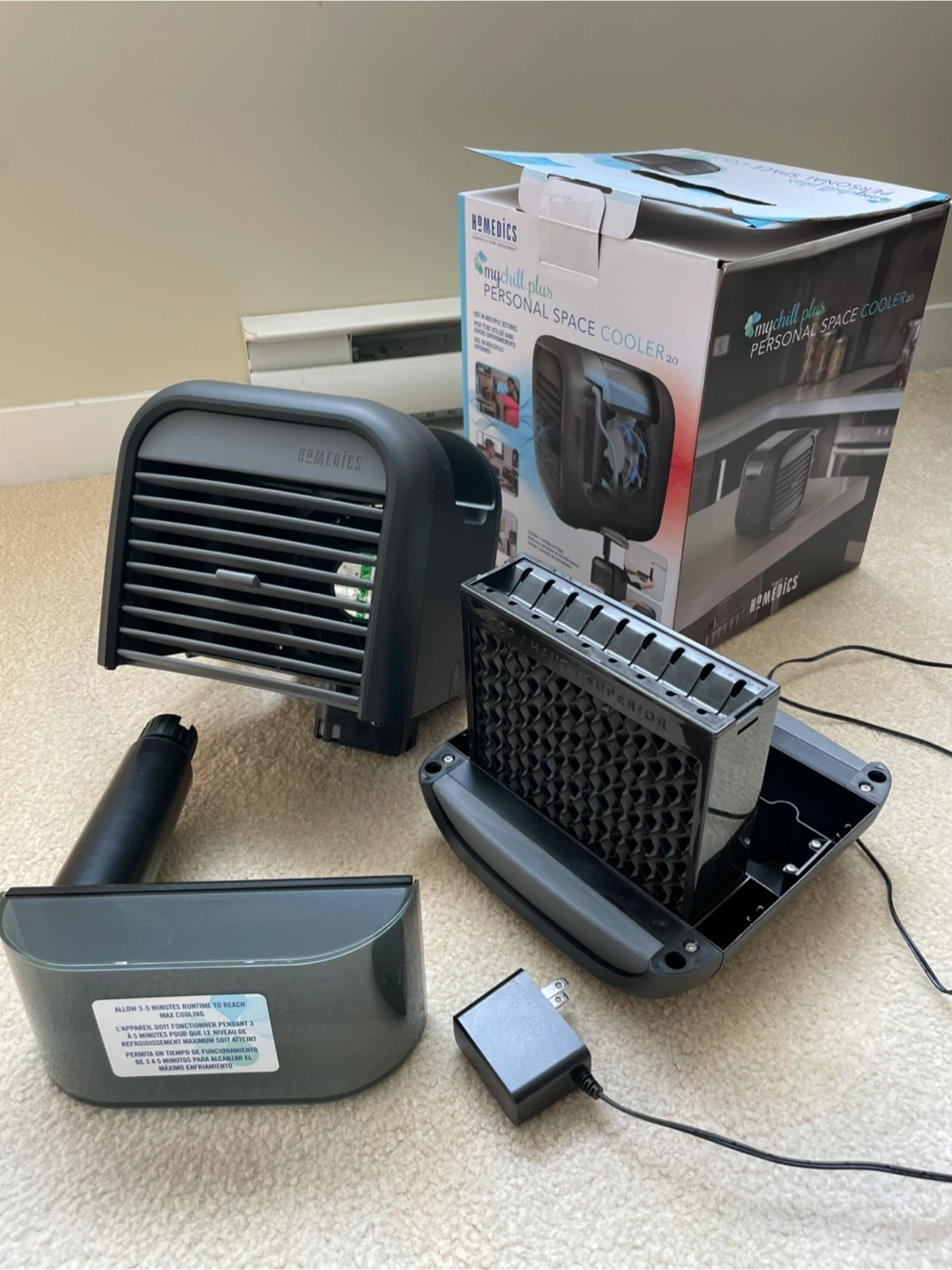 I'm selling a Homedics mychill plus Personal Space Cooler 2.0. This fan uses water to add more chill in the air. The box is included, along with all components. Could also be used for tropical plants needing more moisture.