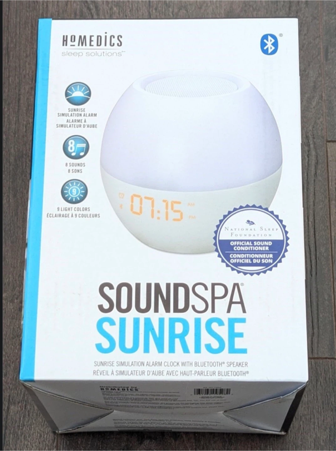Selling a HoMedics SoundSpa Sunrise sound machine. It features 8 digitally mastered sounds for sleep and wake up with a Bluetooth speaker. You can also connect your smart device via Bluetooth to play your own sounds. It also functions as a sunrise simulation alarm clock with Bluetooth speaker and has 9 light colours. Box included