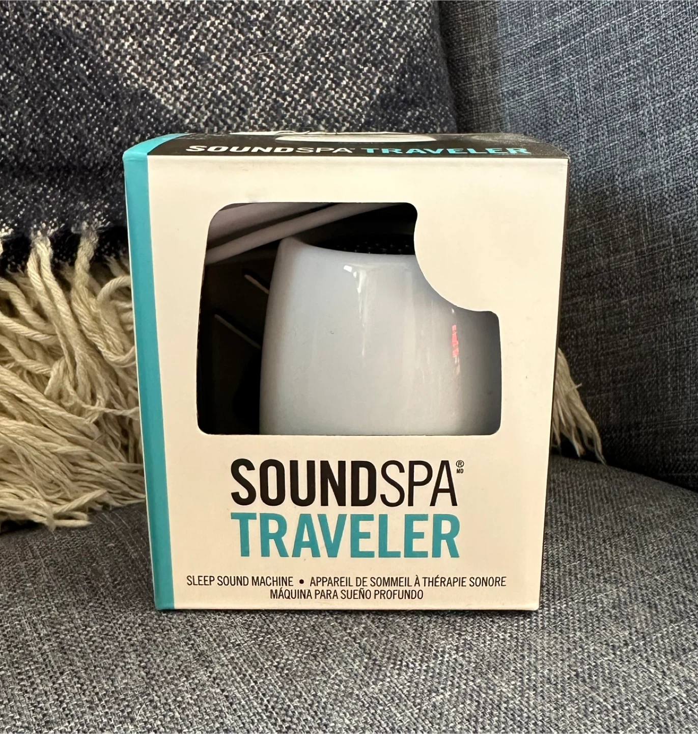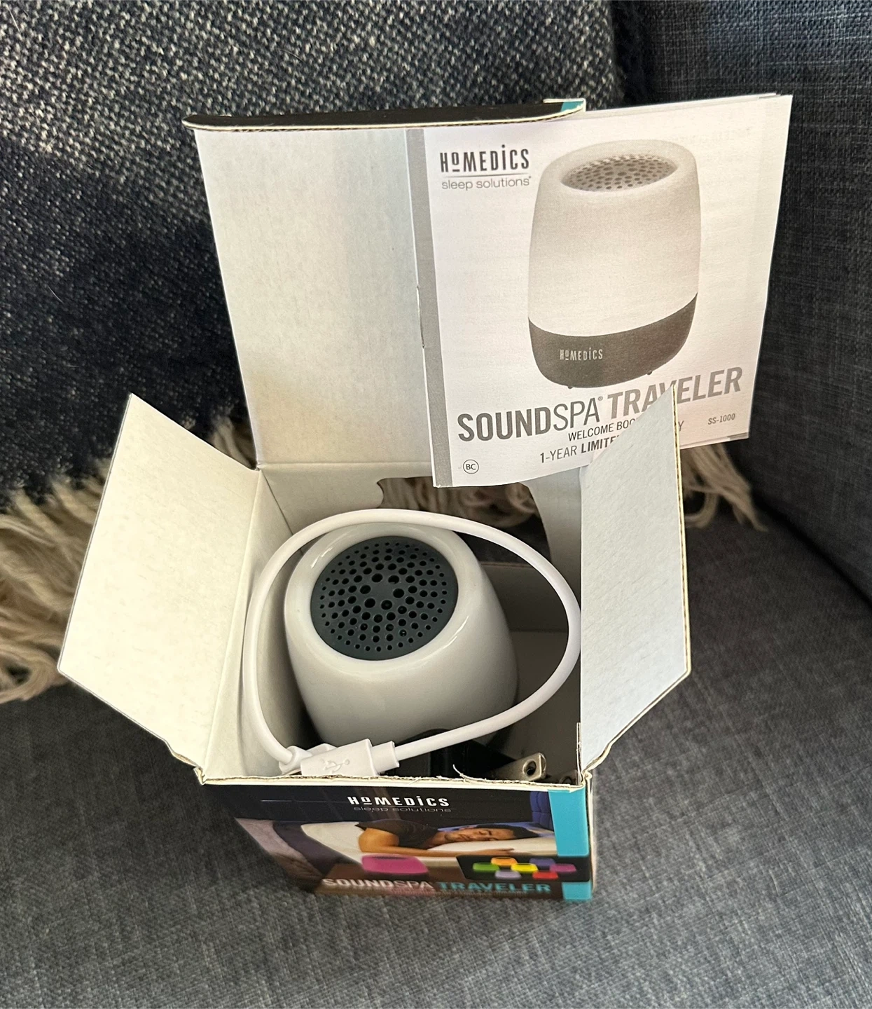 Selling a brand new Homedics SoundSpa Traveler sleep sound machine! It's still in its original box and includes the charging cable. It features 6 nature and relaxation sounds to help you drift off to sleep, including brook, ocean, white noise, thunderstorm, soothing flute, and ASMR tapping. It also has a 30, 60, or 90-minute auto-off timer and lasts up to 12 hours on a single charge. #giftable #health #wellness