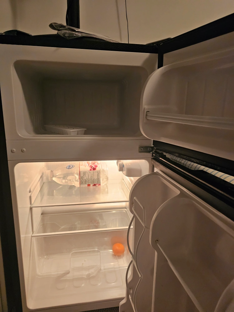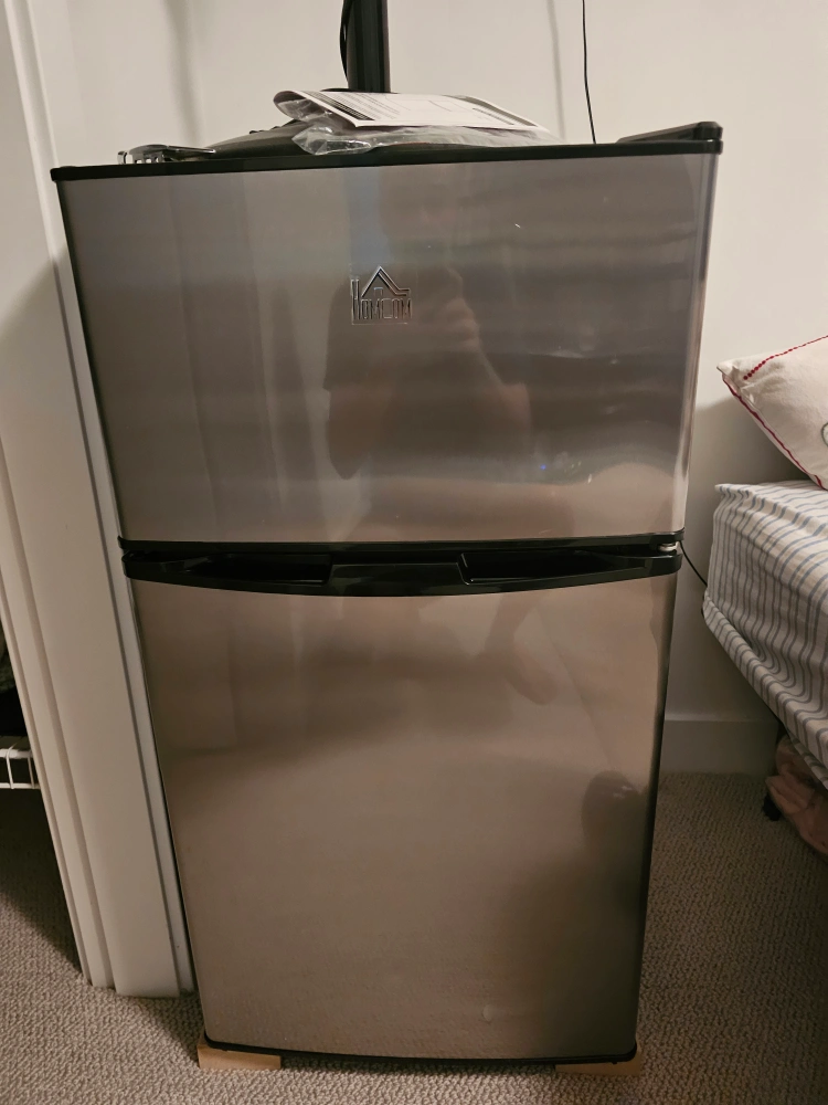Selling a hOmelabs compact refrigerator in silver. It's in great condition and perfect for a small space. It has a freezer on top and a fridge on the bottom with shelves and door storage. A great little fridge!