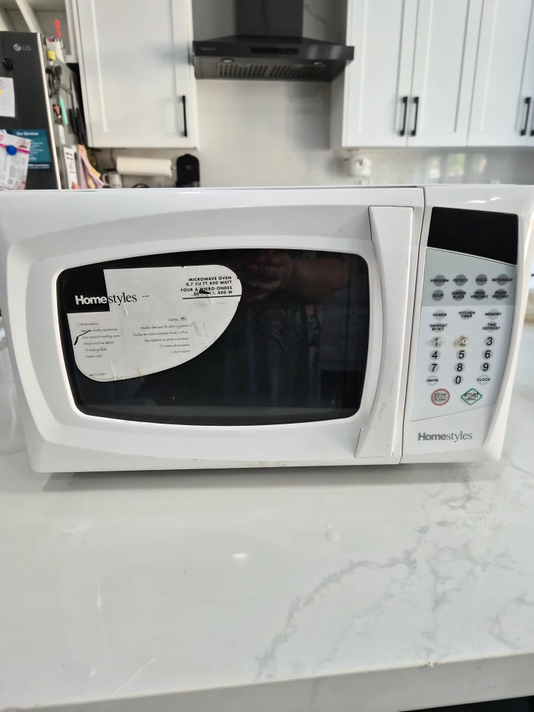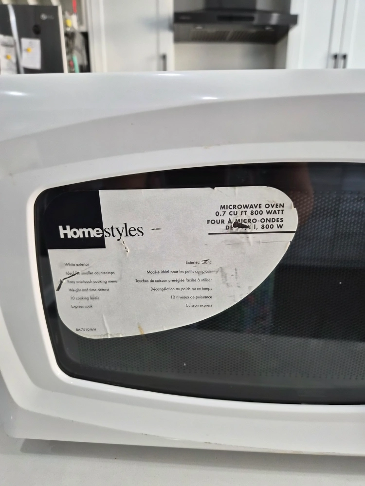 Selling a Homestyles microwave oven, 0.7 cu ft, 800 Watt. It features easy one-touch cooking menus, weight and time defrost, 10 cooking levels, and express cook. Great for smaller countertops!
