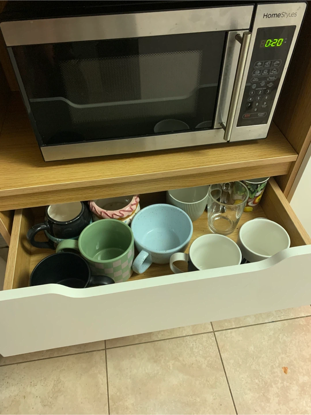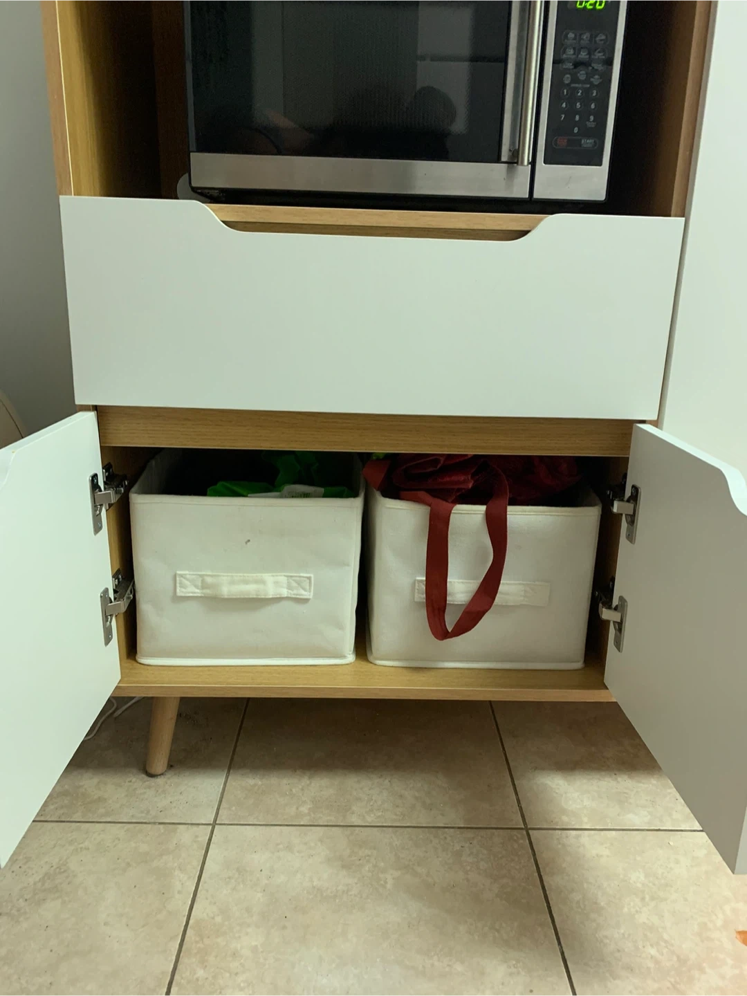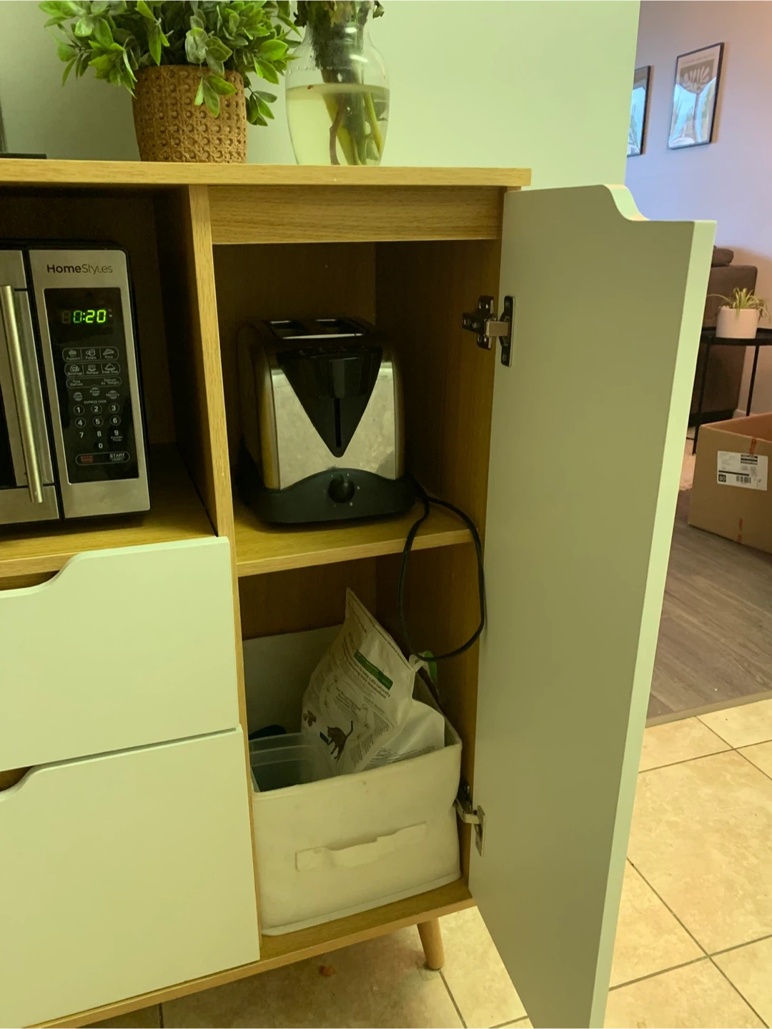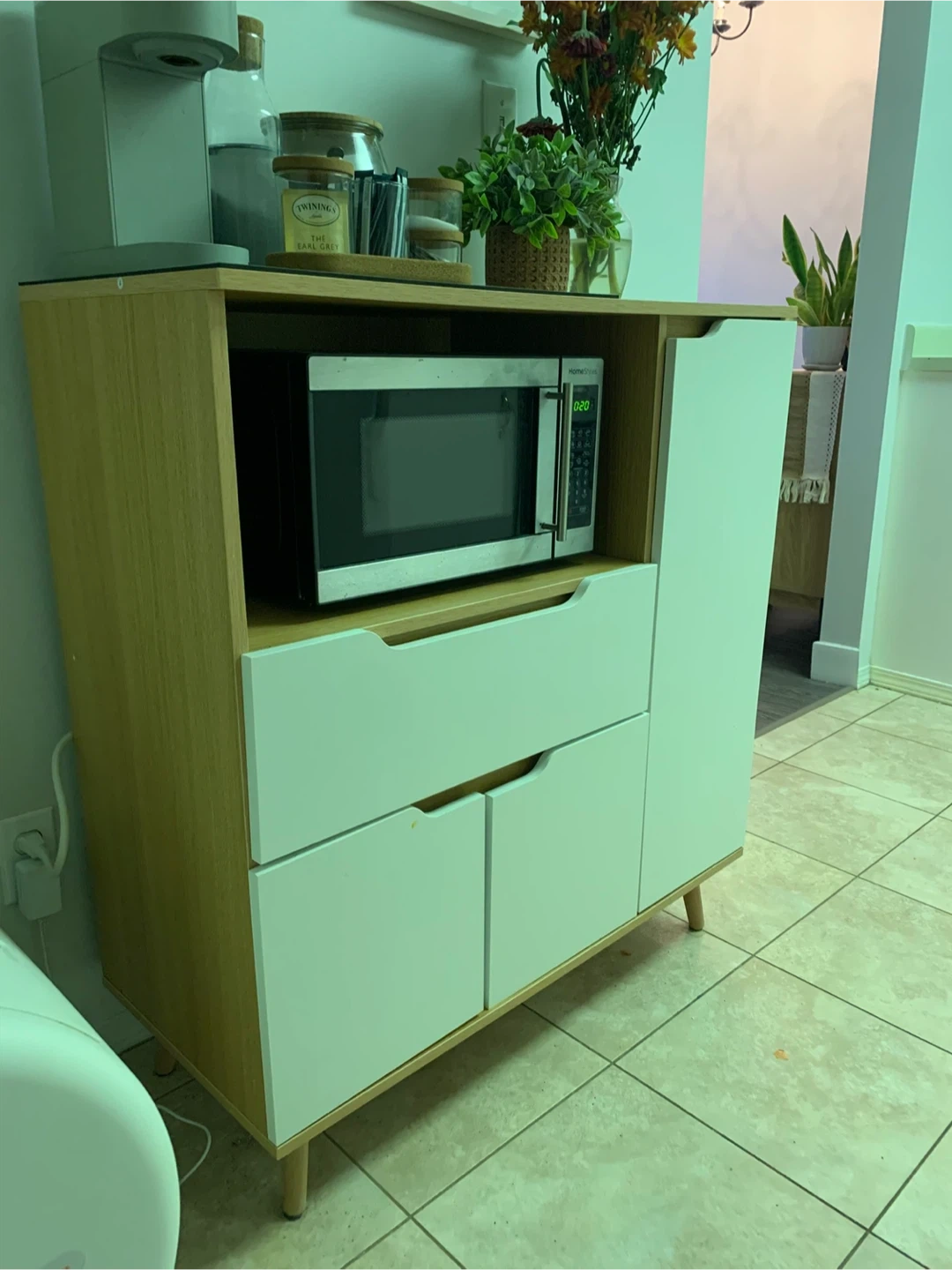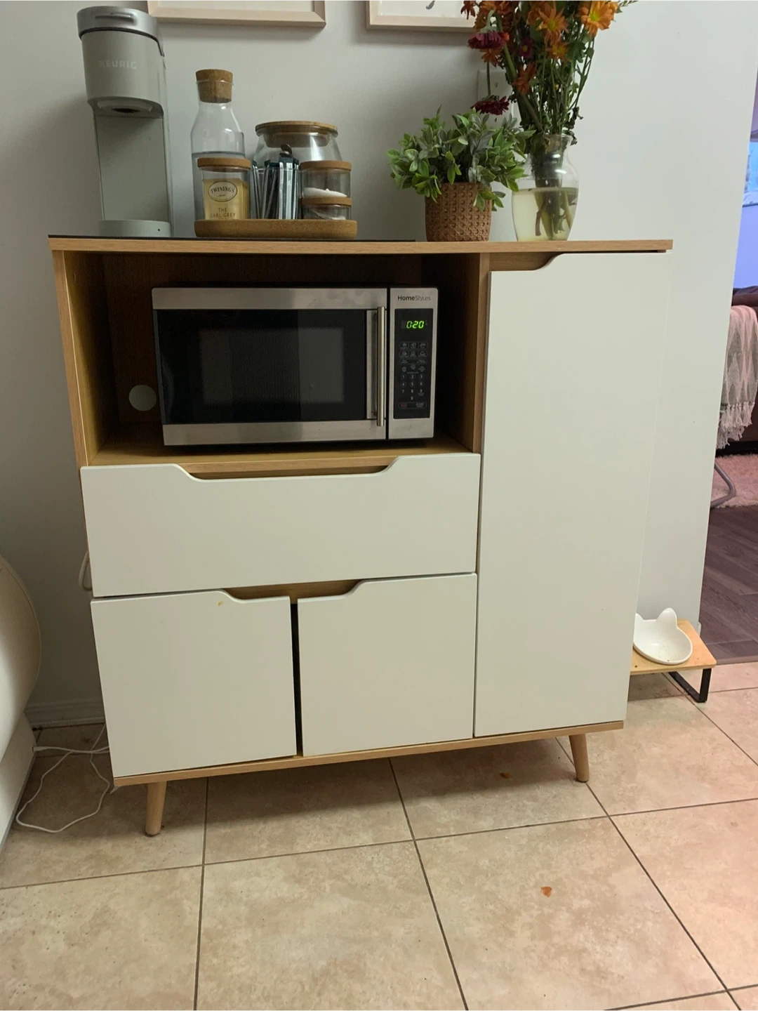 Selling a HomeStyles kitchen cabinet in great condition! It features a dedicated shelf for a microwave, along with drawers and cabinet space for all your kitchen storage needs. Perfect for adding extra storage to your kitchen or dining area!