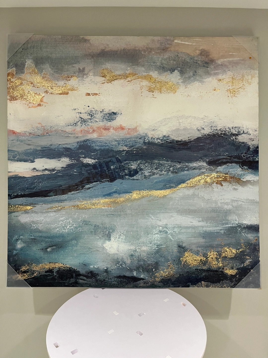 Large square canvas wall art. Abstract design featuring blues, golds, and creams. Features a wooden frame. Excellent for adding a modern touch to any room.