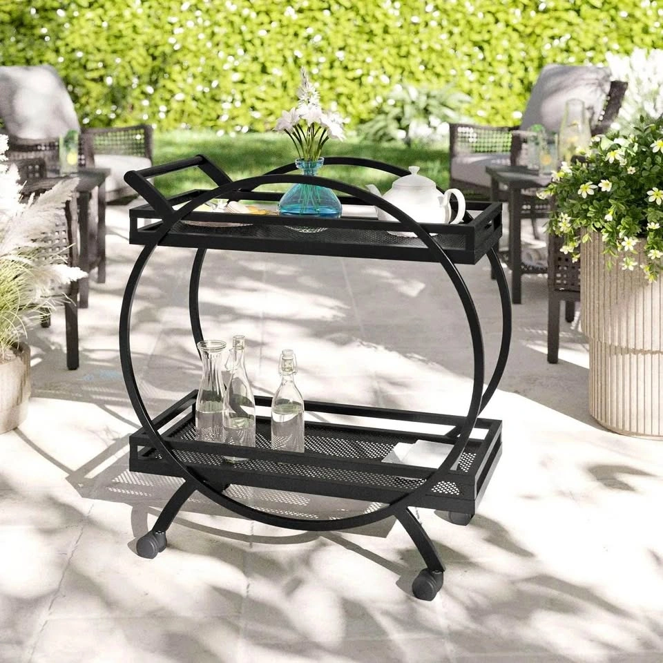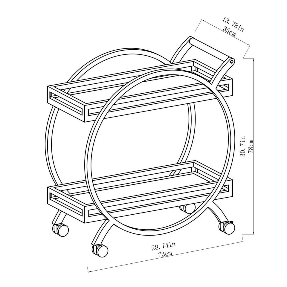 Brand new in box. Heavy-duty, rust-resistant, powder-coated steel frame. Wheels for easy mobility. Bar Cart measures: 28.7 in. W x 15 in. D x 30.7 in. H