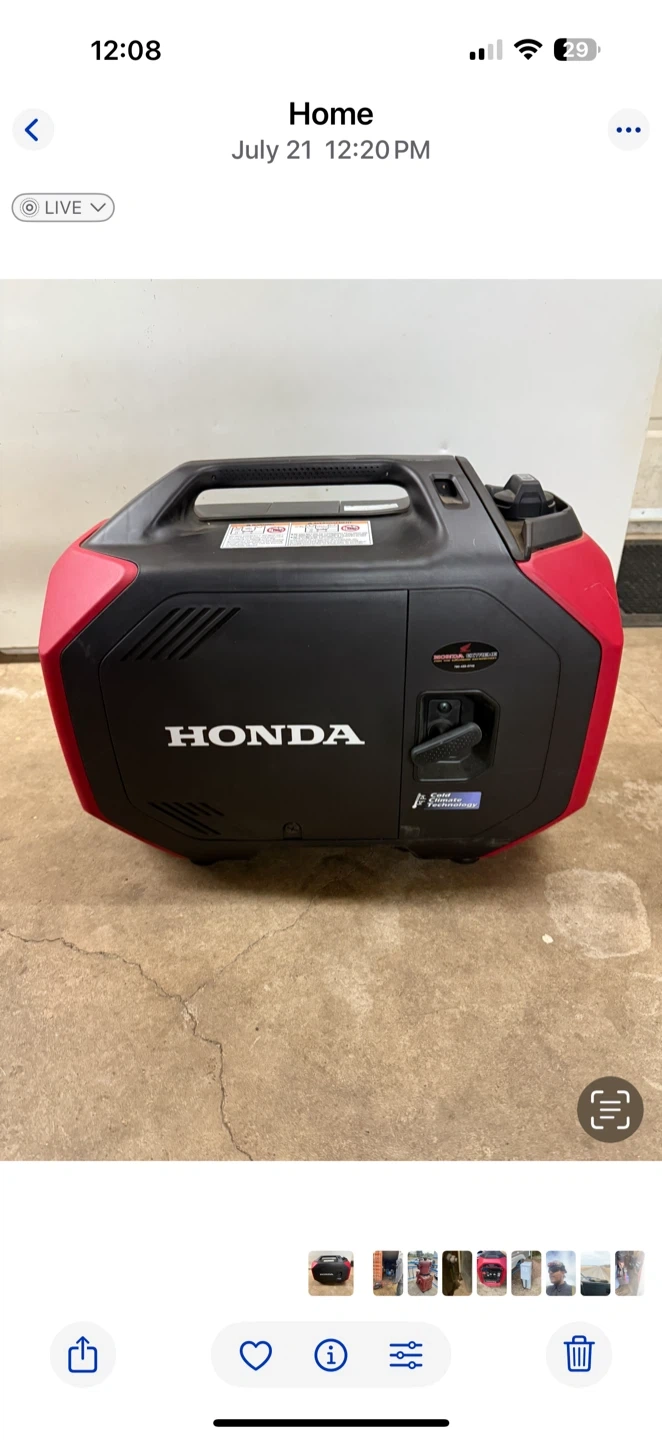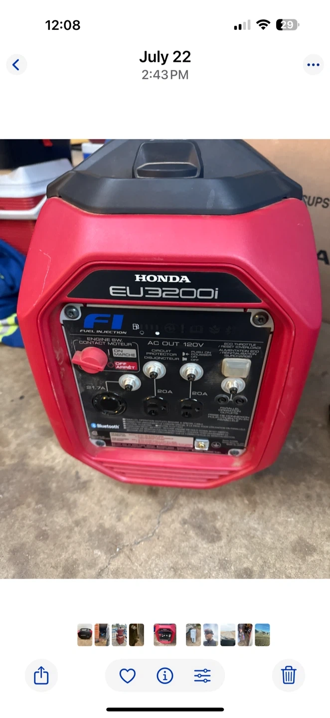 Selling a Honda EU3200i generator. It's an ultra-quiet model, perfect for camping or backup power. Only used once, only has one hour run time. Bought new for $3500. Would like to get $2500. Check out the photos for details!