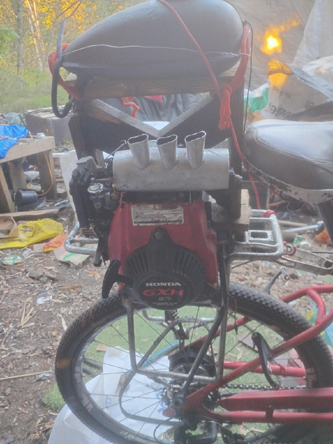 Selling a Honda GXH50 engine bicycle. It's a unique, custom-built bike with a Honda GXH50 engine mounted on the rear. Great for a project or a fun ride!