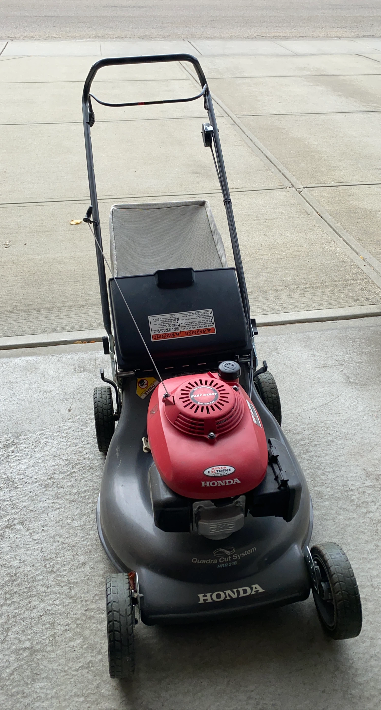 Selling a Honda HRR 216 lawnmower with the Quadra Cut System. It has an Easy Start feature for convenience. Great for keeping your lawn looking tidy!