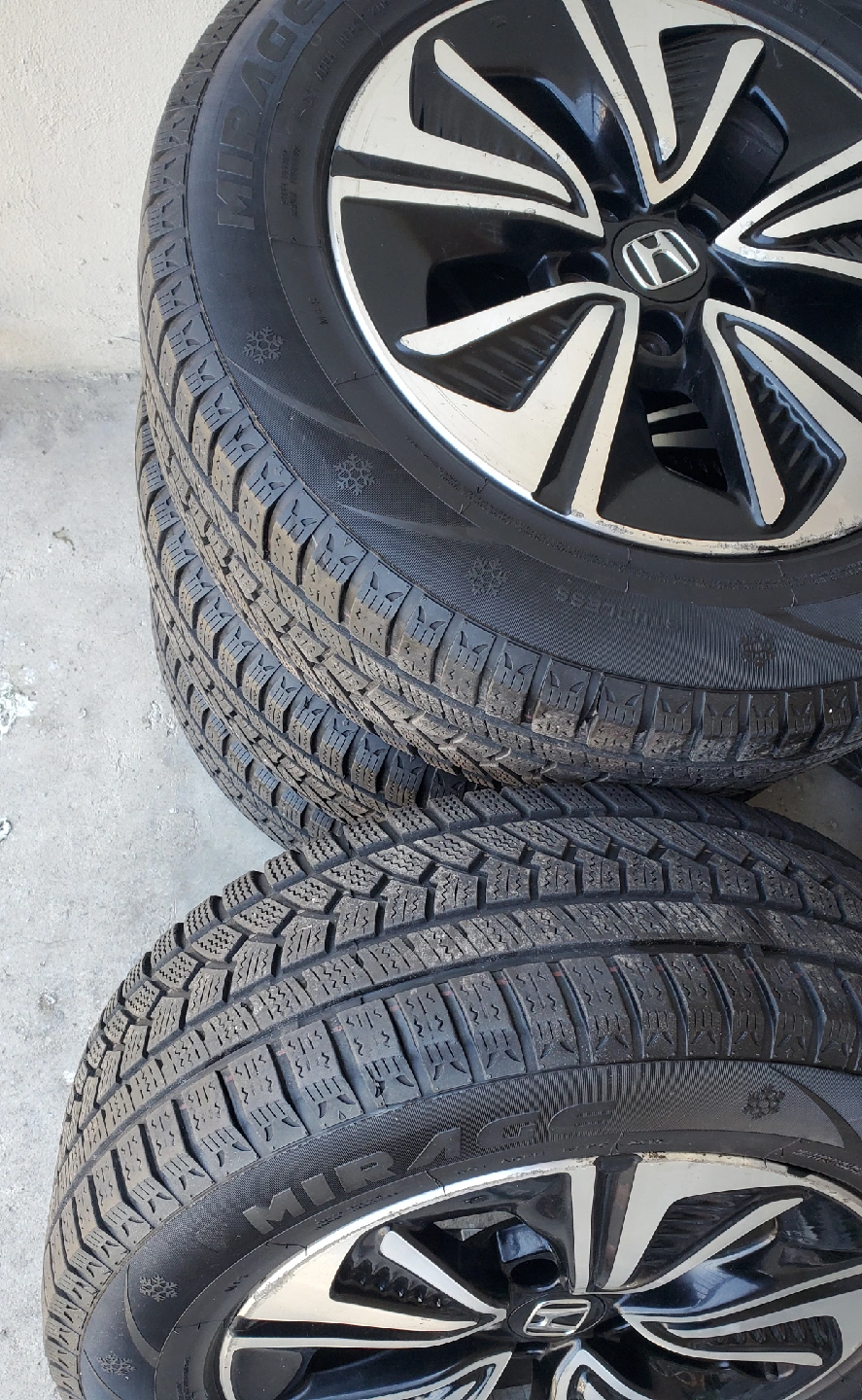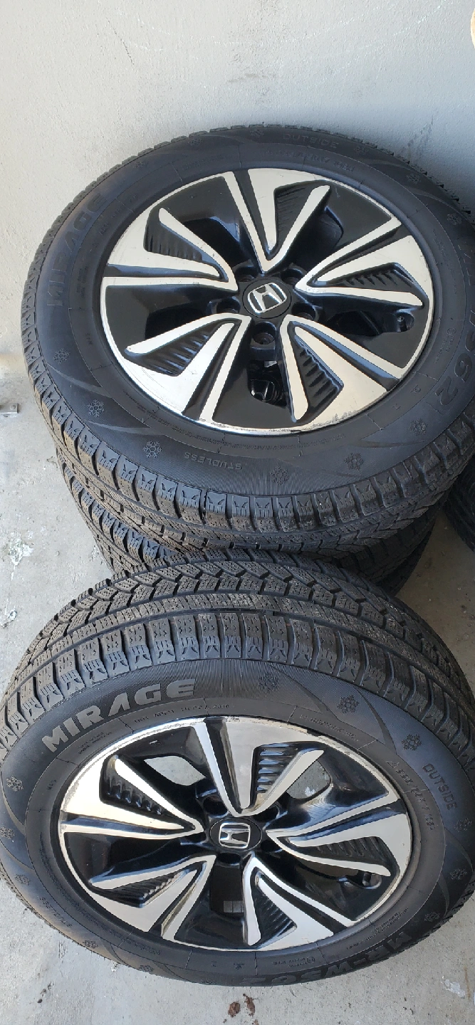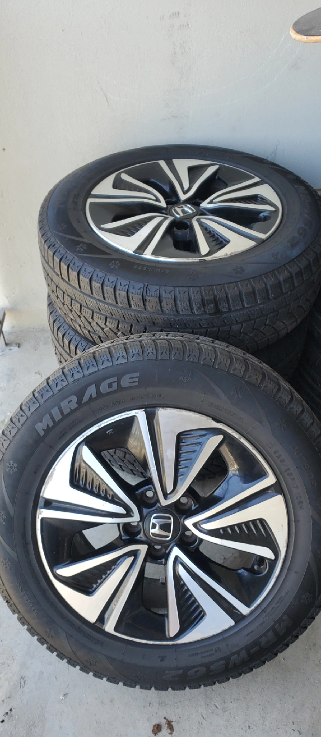 Selling a set of Honda Mirage winter tires. The tire size is 225/65R17. They are in good condition and ready for the winter season