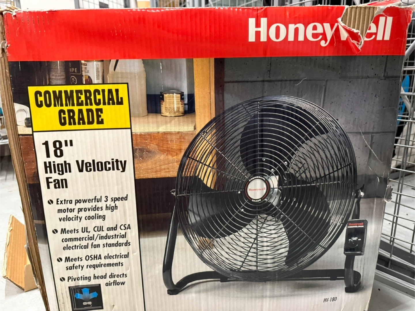 Selling a Honeywell 18" high velocity fan. It's a commercial grade fan with an extra powerful 3-speed motor that provides high velocity cooling. It meets UL, CUL and CSA commercial/industrial electrical fan standards and OSHA electrical safety requirements. The pivoting head directs airflow.