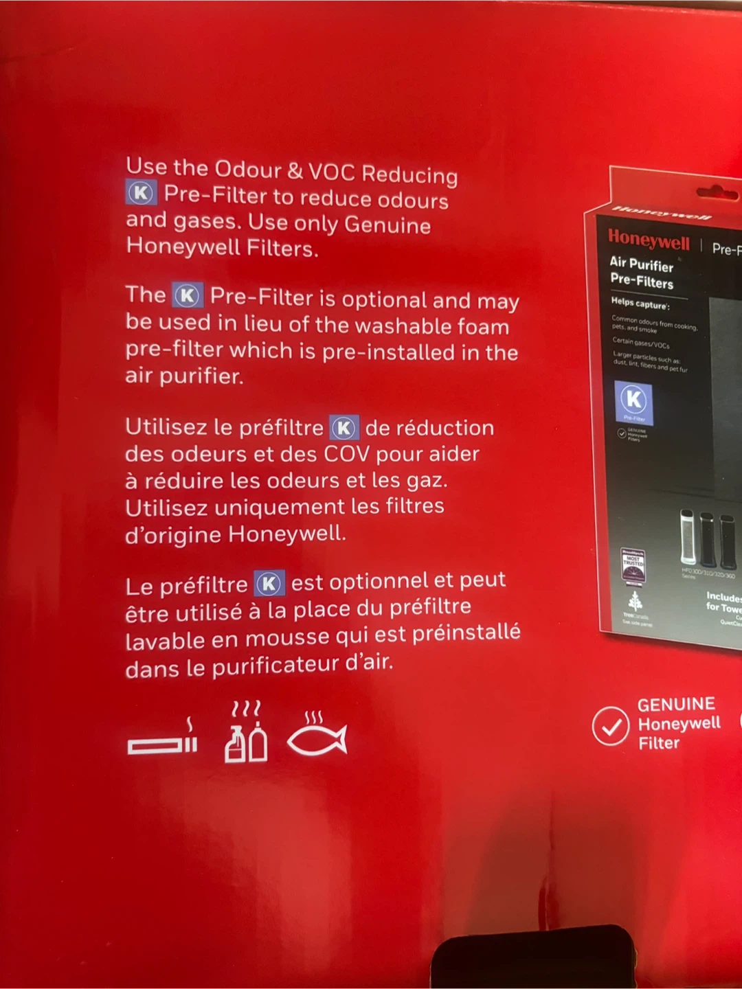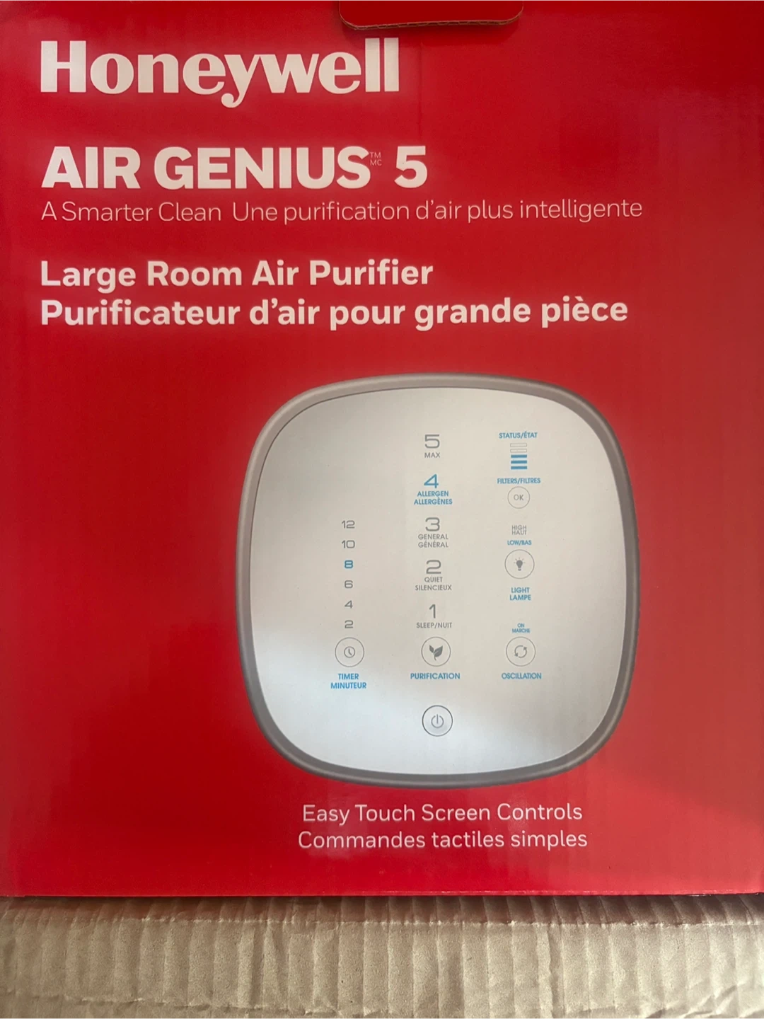 Selling a Honeywell Air Genius 5 Large Room Air Purifier! It features easy touch screen controls. It also comes with a pre-filter to help capture common odours from cooking, certain gases/VOCs, and larger particles such as dust, lint, fibers, and pet fur. Includes an owner's manual and pre-filters for tower air purifiers.
