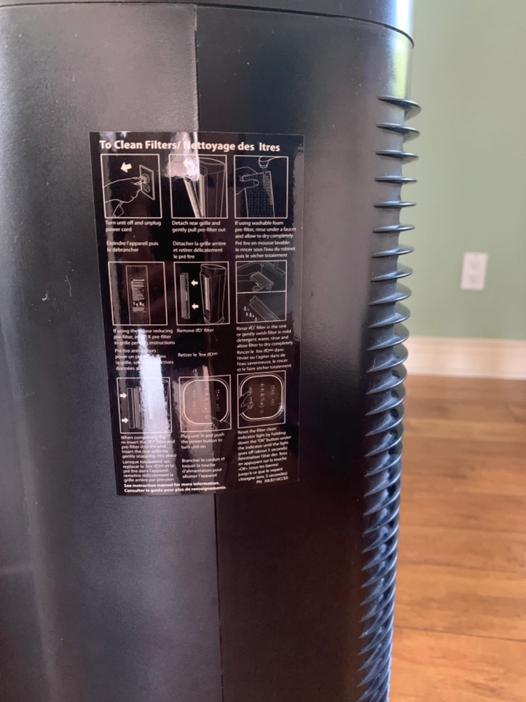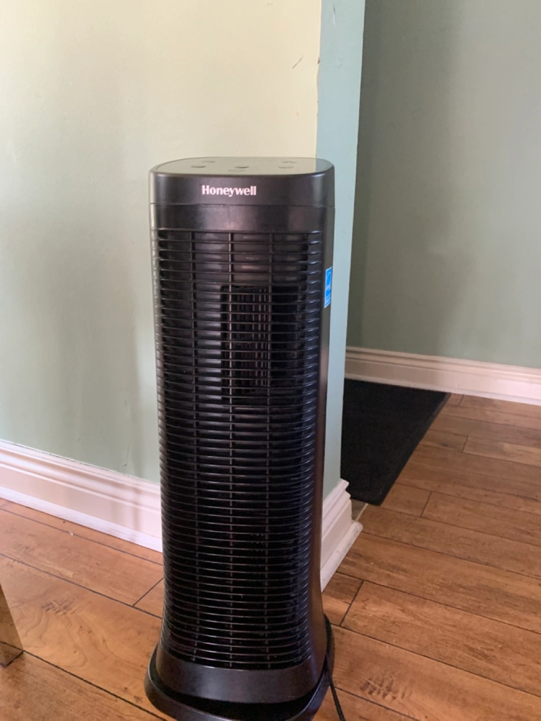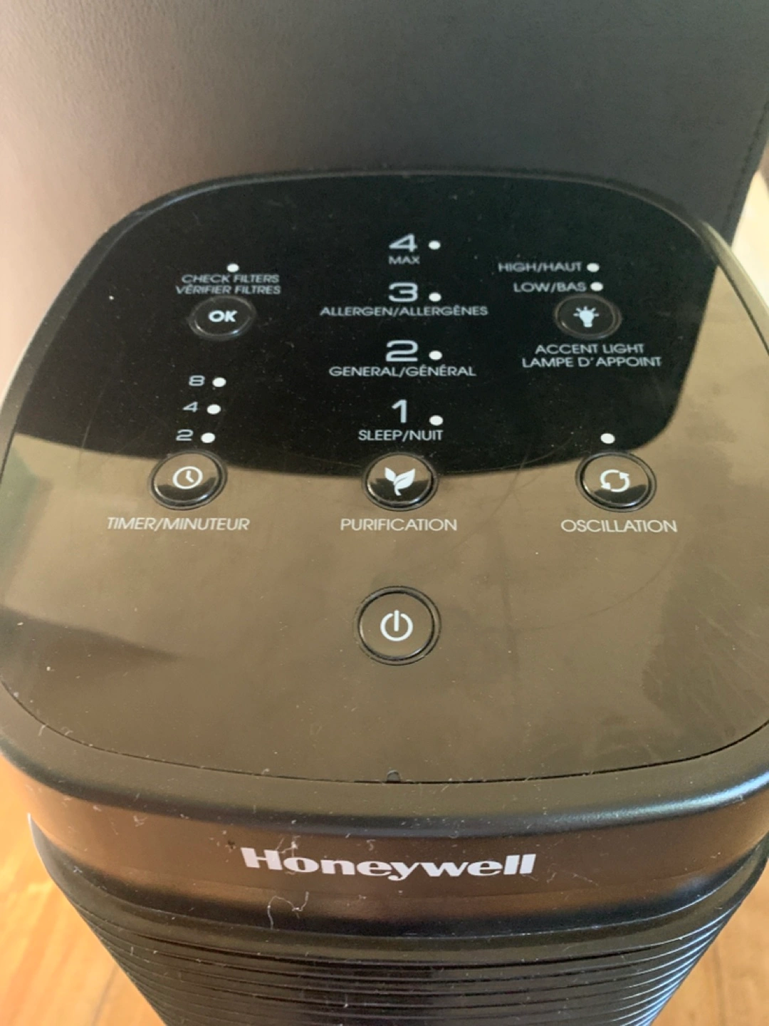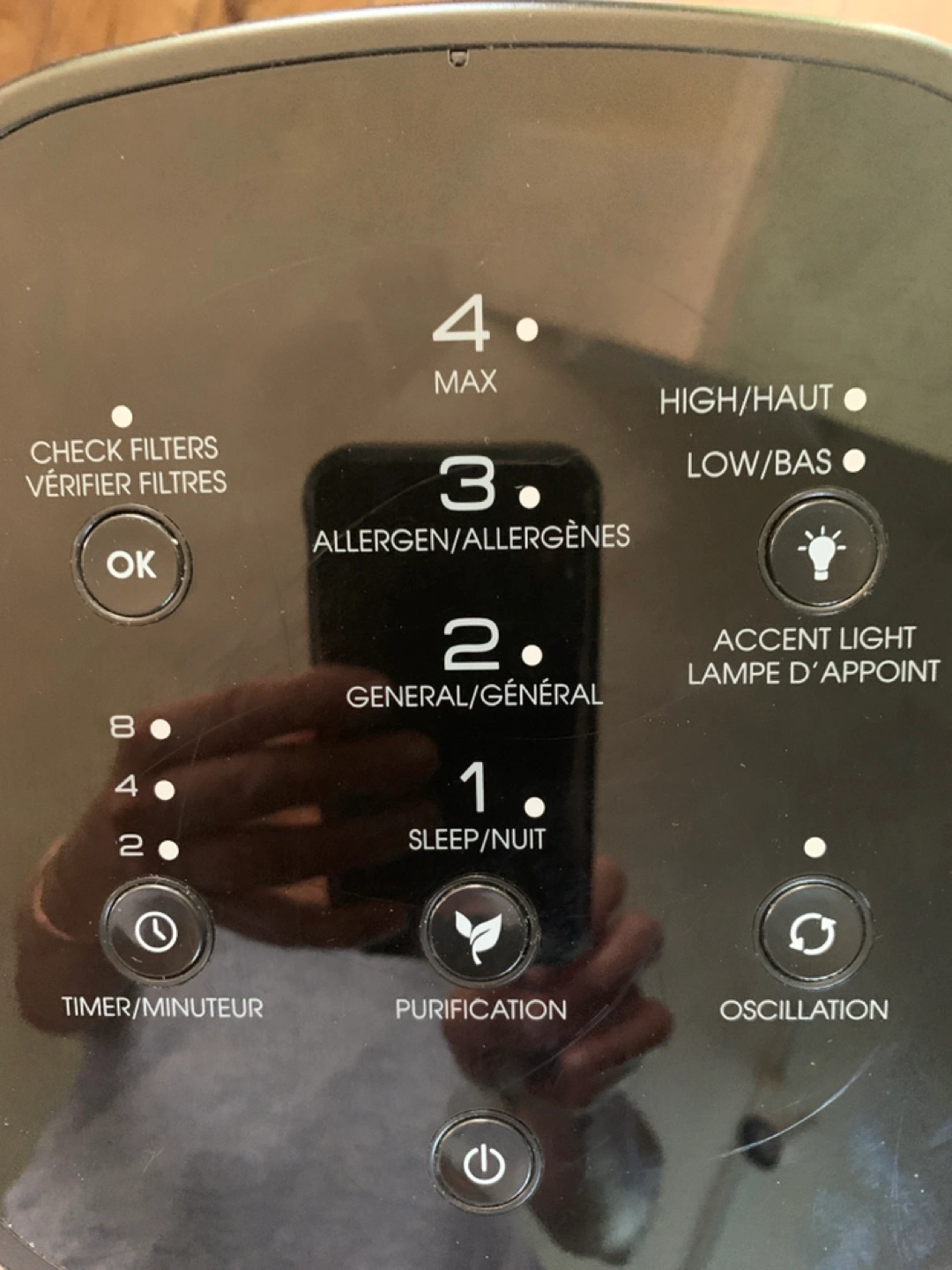 Air purifier in black. Features multiple settings. Controls for timer, purification and oscillation. Great for getting a peaceful night’s sleep.