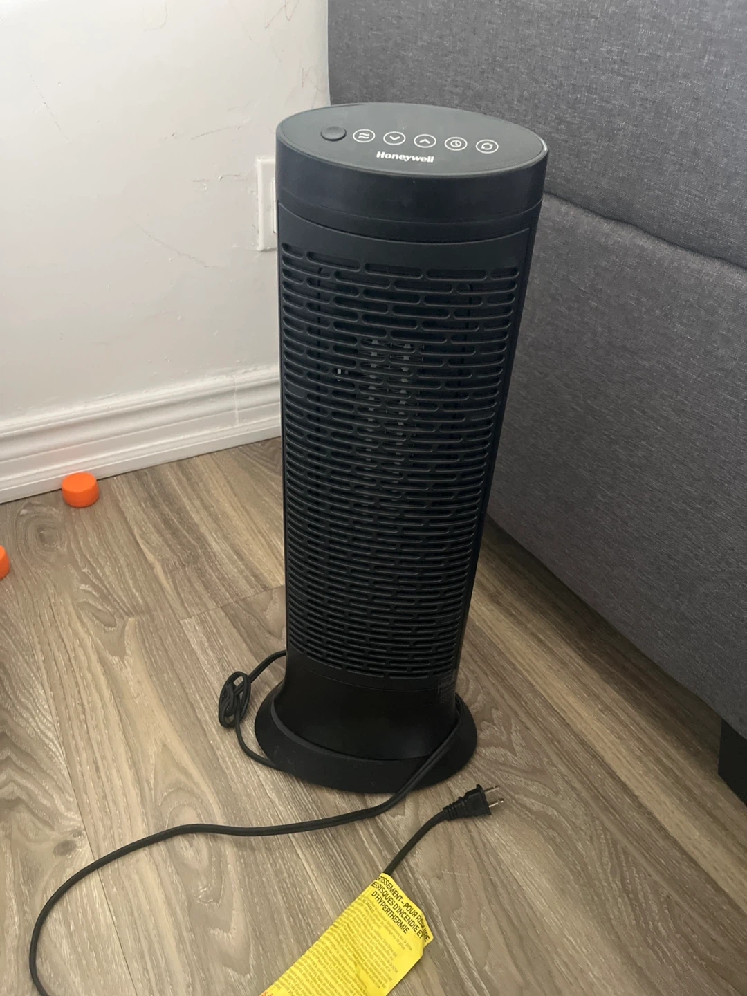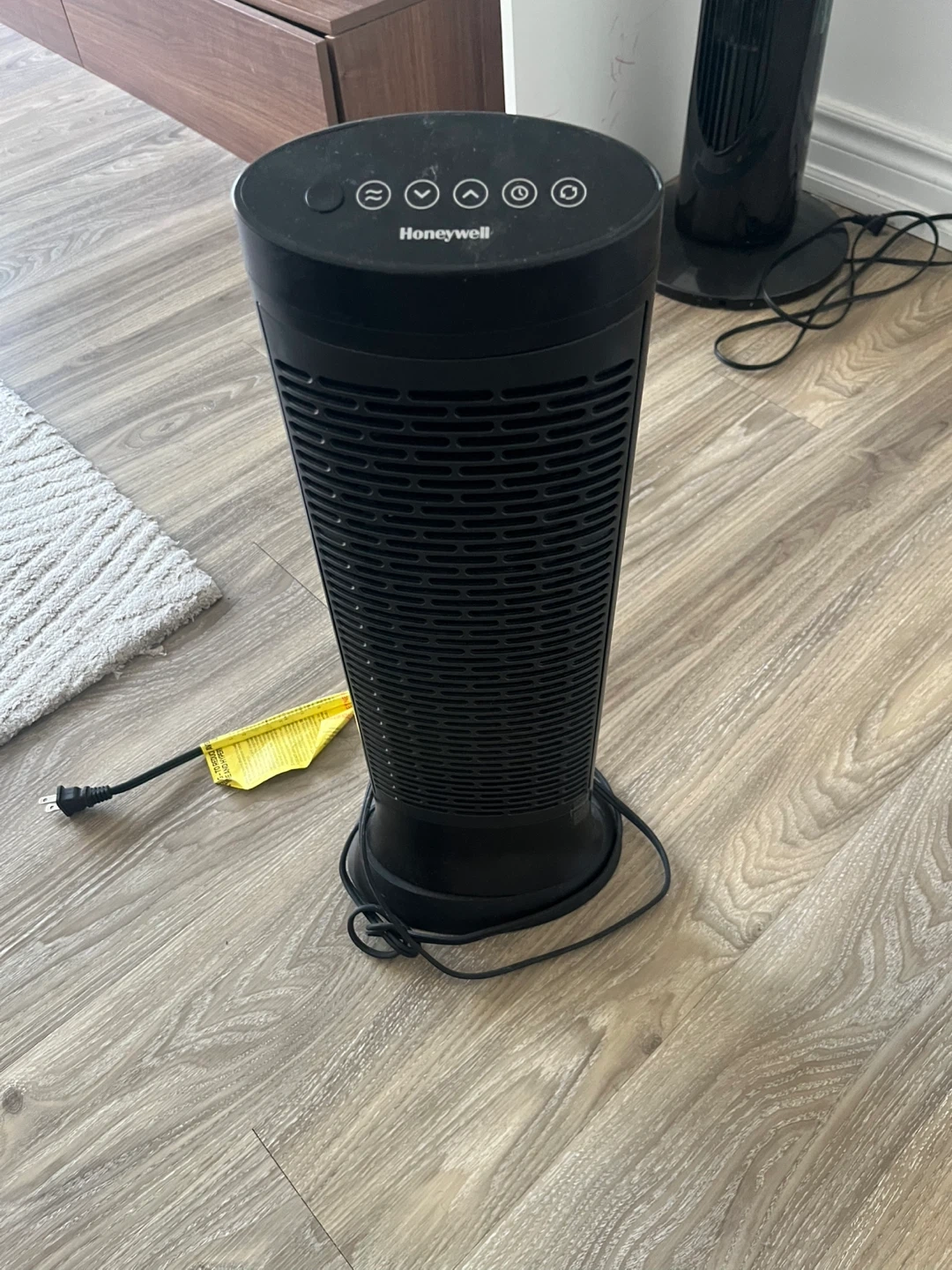 Selling a Honeywell tower heater fan in black. It's in great condition and works perfectly. It's a great way to keep cool during the summer months!