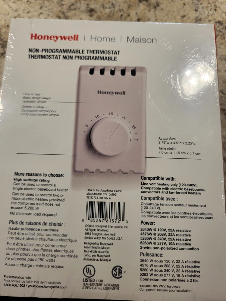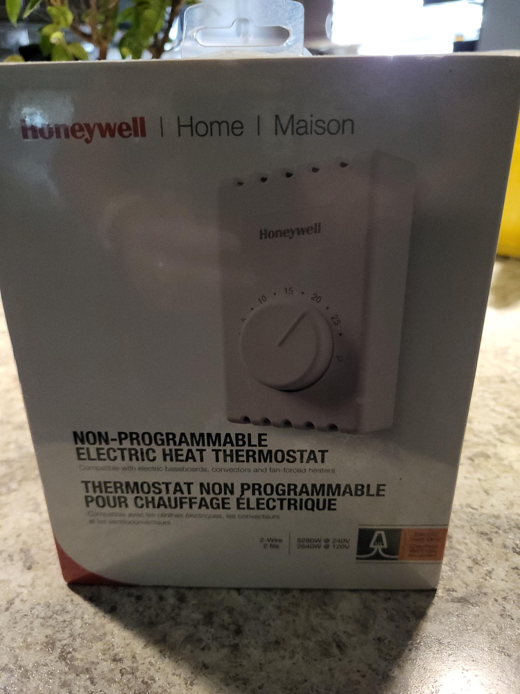 Selling a Honeywell non-programmable electric heat thermostat! It's compatible with electric baseboards, convectors, and fan-forced heaters. Key features: - Easy to use with a simple design - High wattage rating - Can be used to control a single electric baseboard heater - Compatible with line voltage heating (120-240V) Dimensions: 2.75" x 4.5" x 2.25" (7.0 cm x 11.5 cm x 5.7 cm) Includes mounting hardware