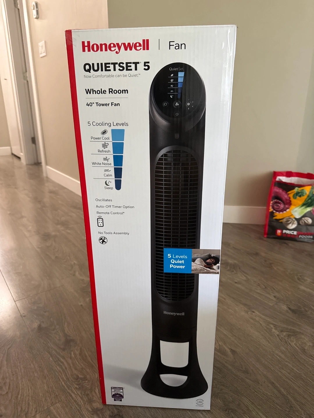 I'm selling a brand new Honeywell QuietSet 5 Whole Room Tower Fan! This fan has 5 cooling levels, an auto-off timer option, and remote control. It oscillates and requires no tools for assembly.