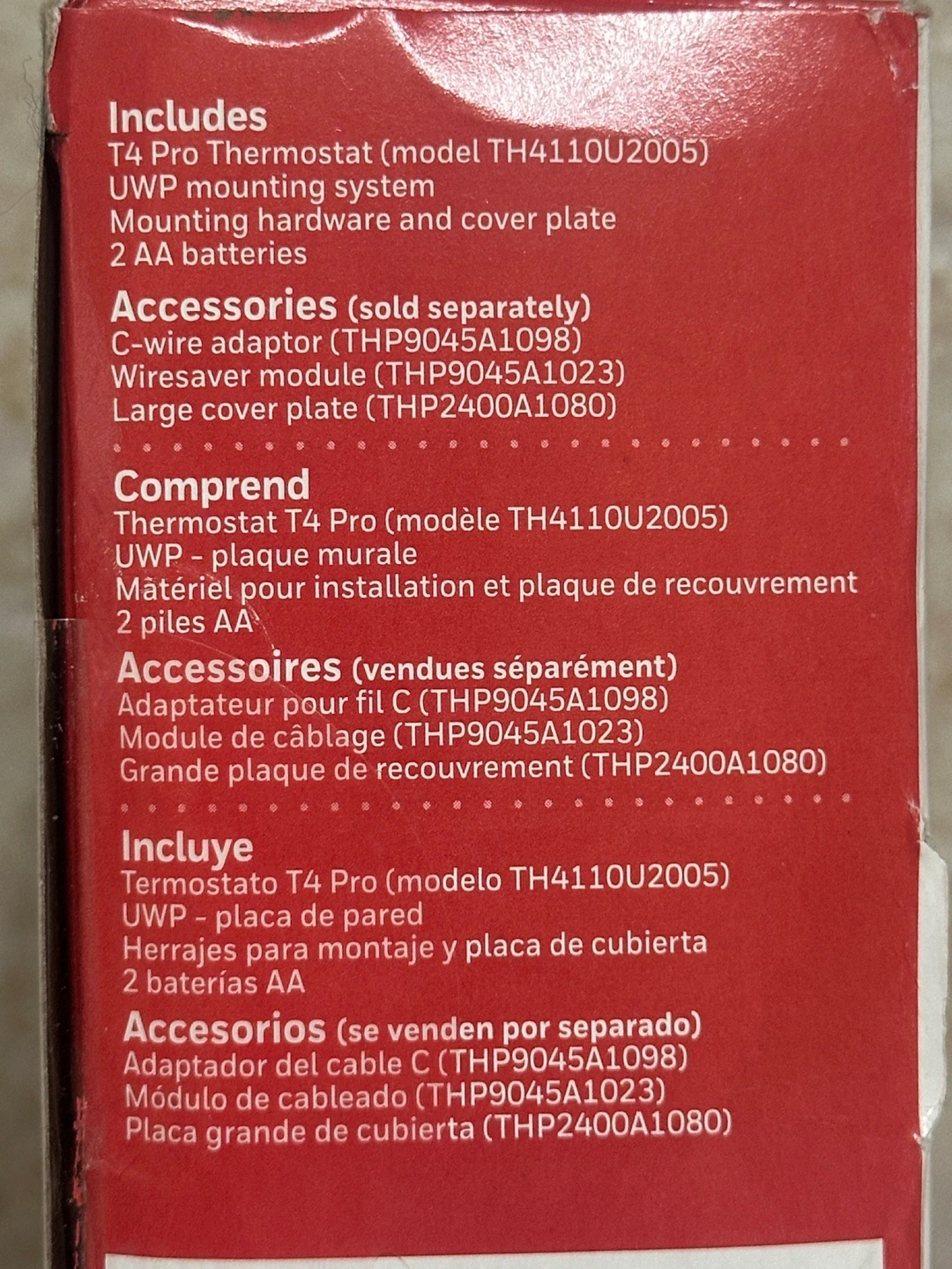 Mississauga, Brandnew Honeywell T4 Pro Programmable Thermostat $80 firm Also offer remote control via an app It supports 1 heat/1 cool heat pump and 1 heat/1 cool conventional systems, operating on 24 VAC and can be powered by battery or hardwired