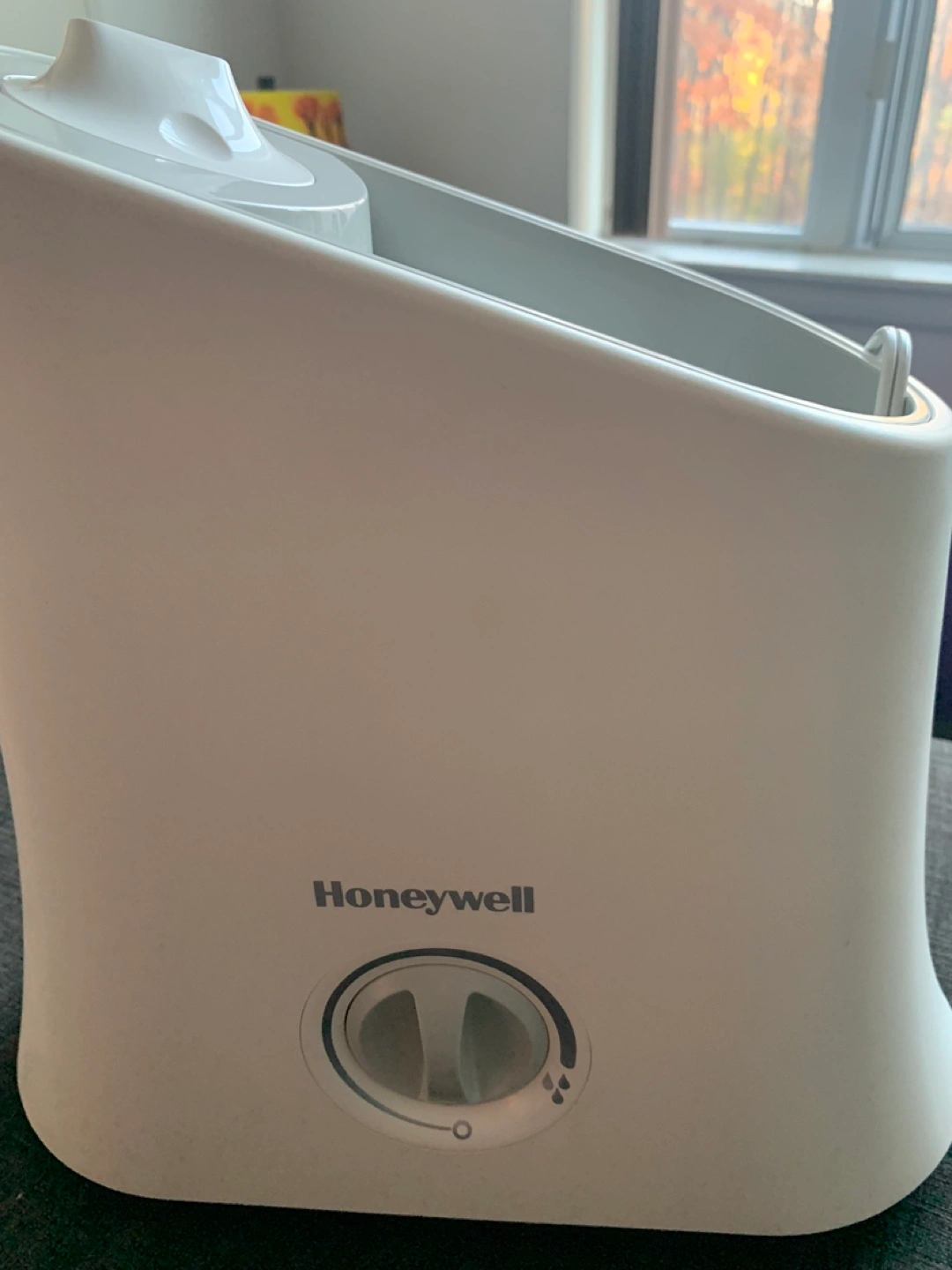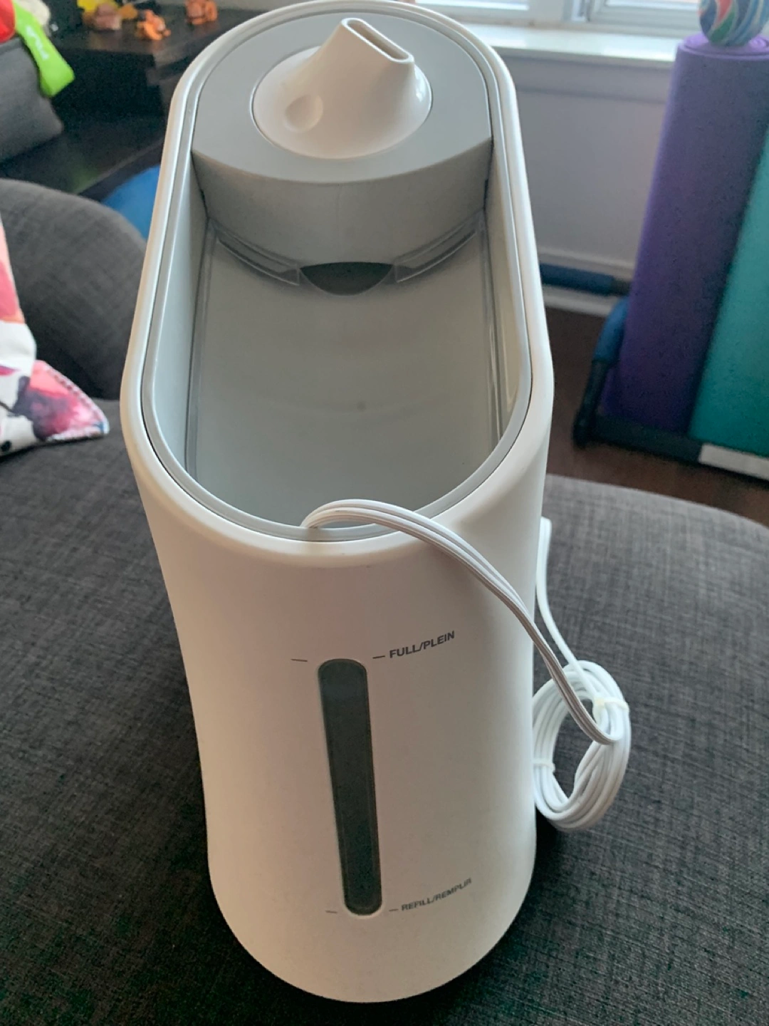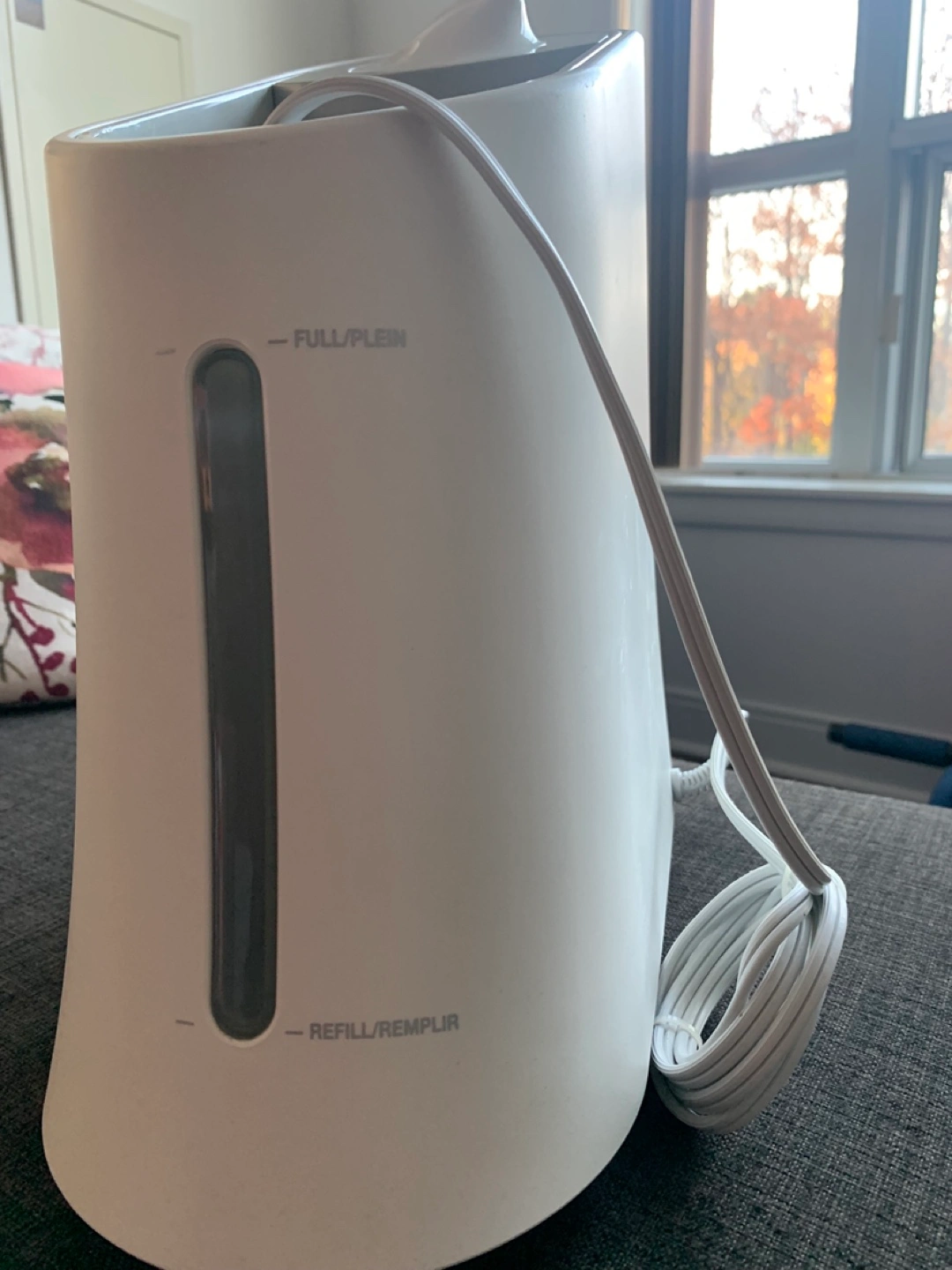 Clean, gently used humidifier. White plastic. Features adjustable mist output. Includes power cord. Easy to refill.