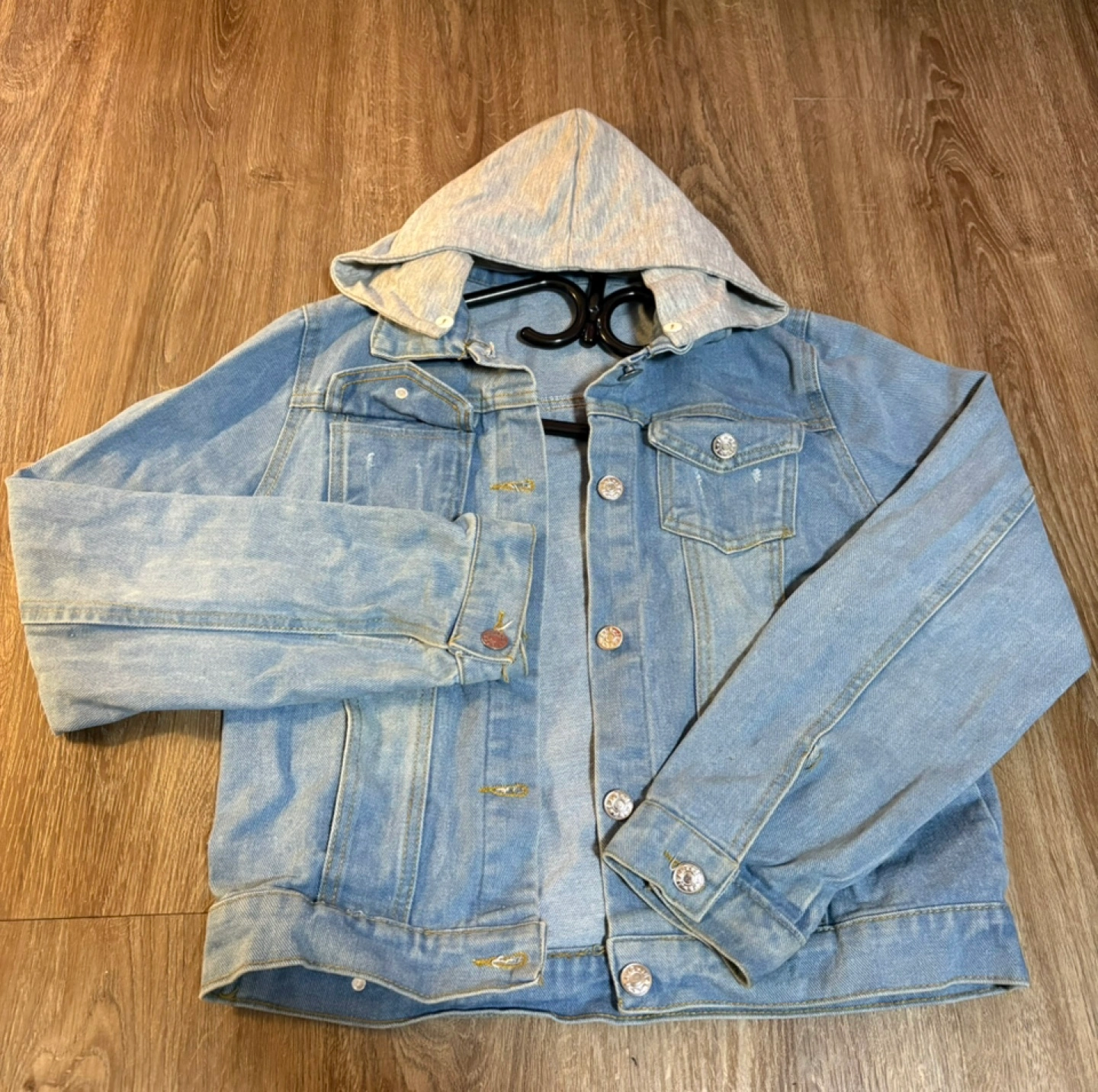Selling a hooded denim jacket in a light wash. The hood is a soft grey material. It's in great condition and ready for a new home!