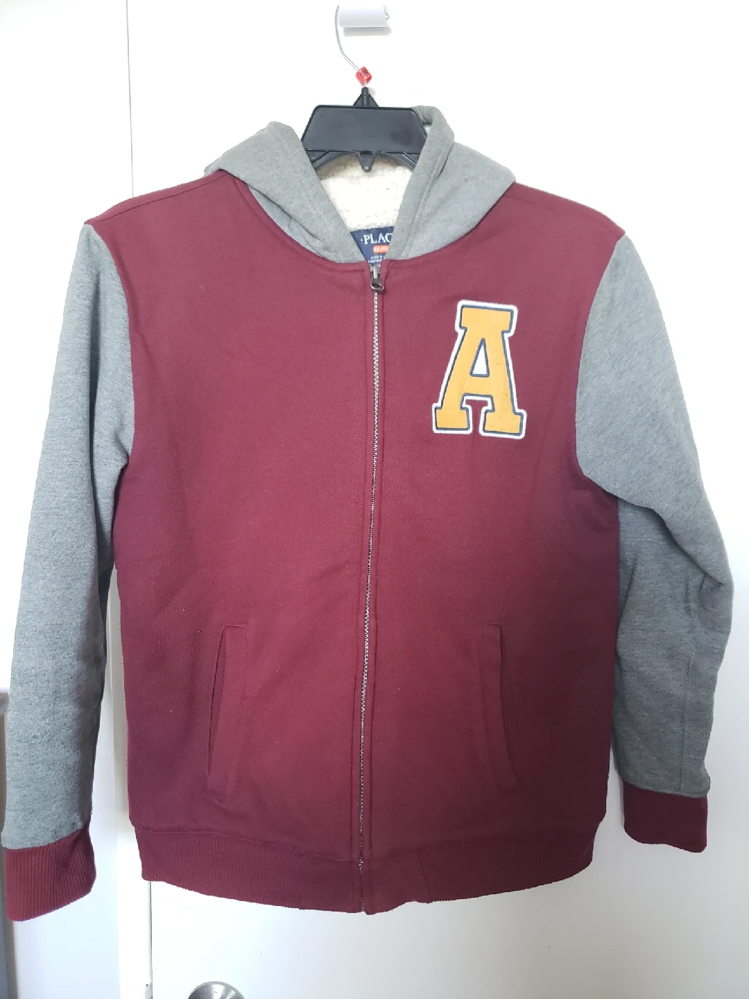 Cozy The Children's Place hoodie in size XXL (16). It features a soft, sherpa-like lining and a cool varsity-style design with a big 'A' on the front. The hoodie is in great shape and ready for a new home!