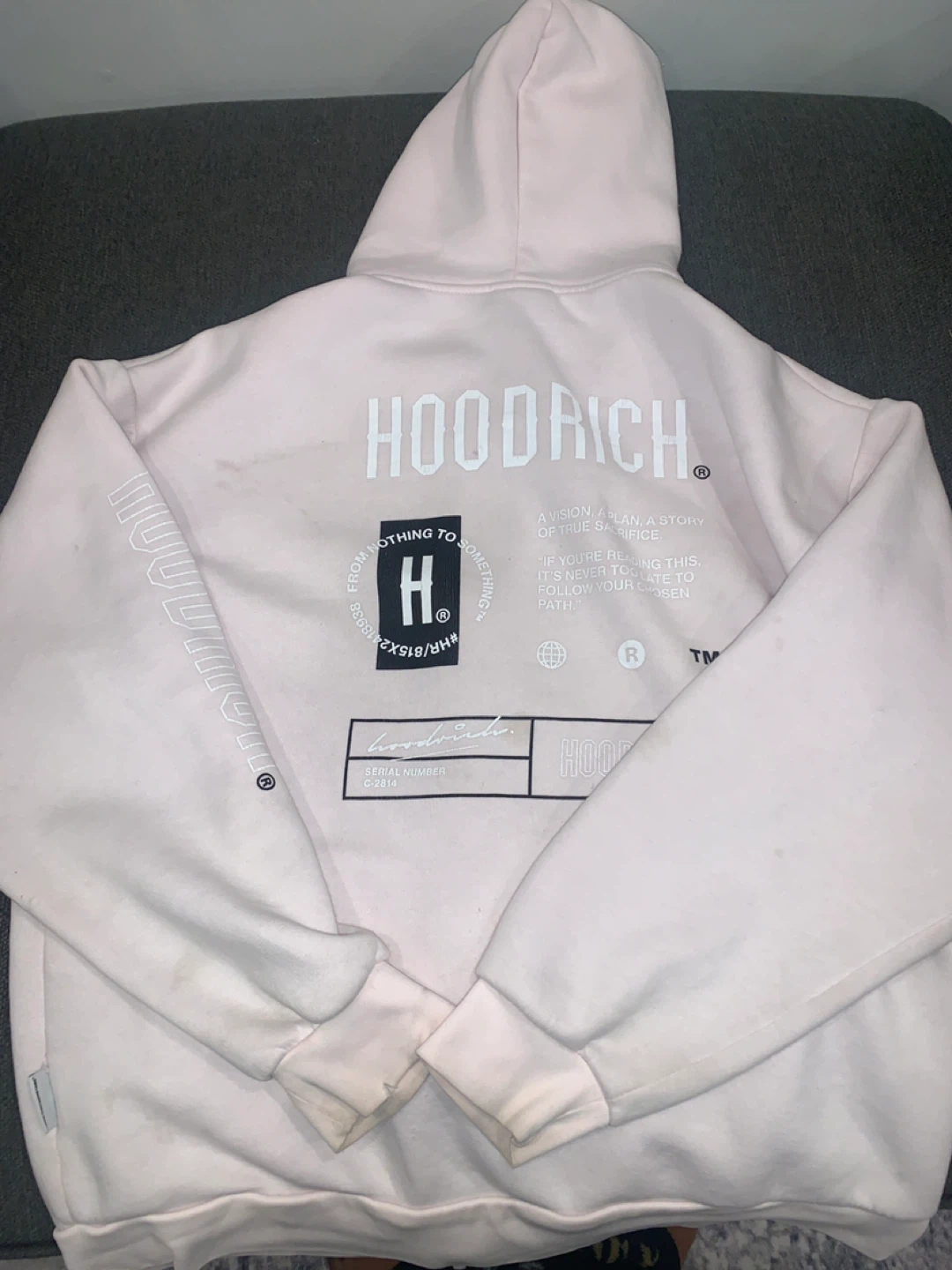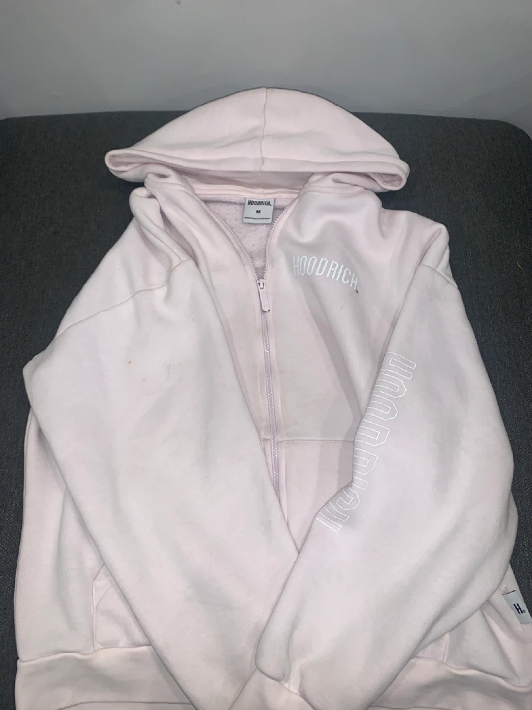 Selling a Hoodrich hoodie in pink, size medium. It's a zip-up style and has the Hoodrich logo on the front and back. There are some signs of wear, as pictured.