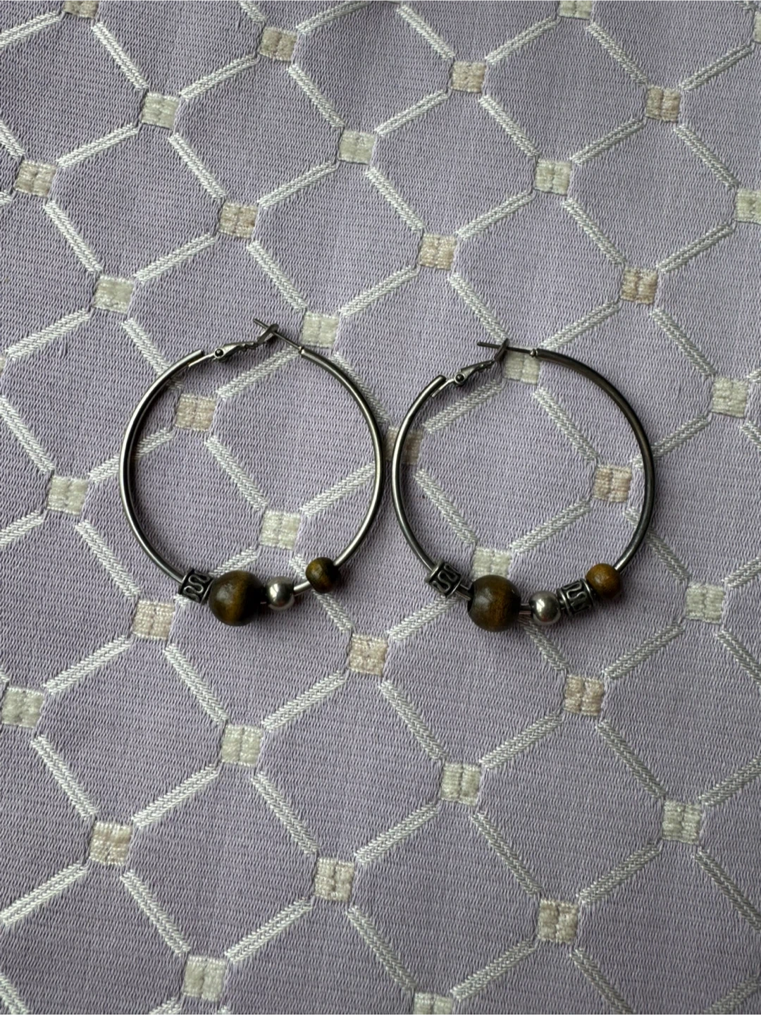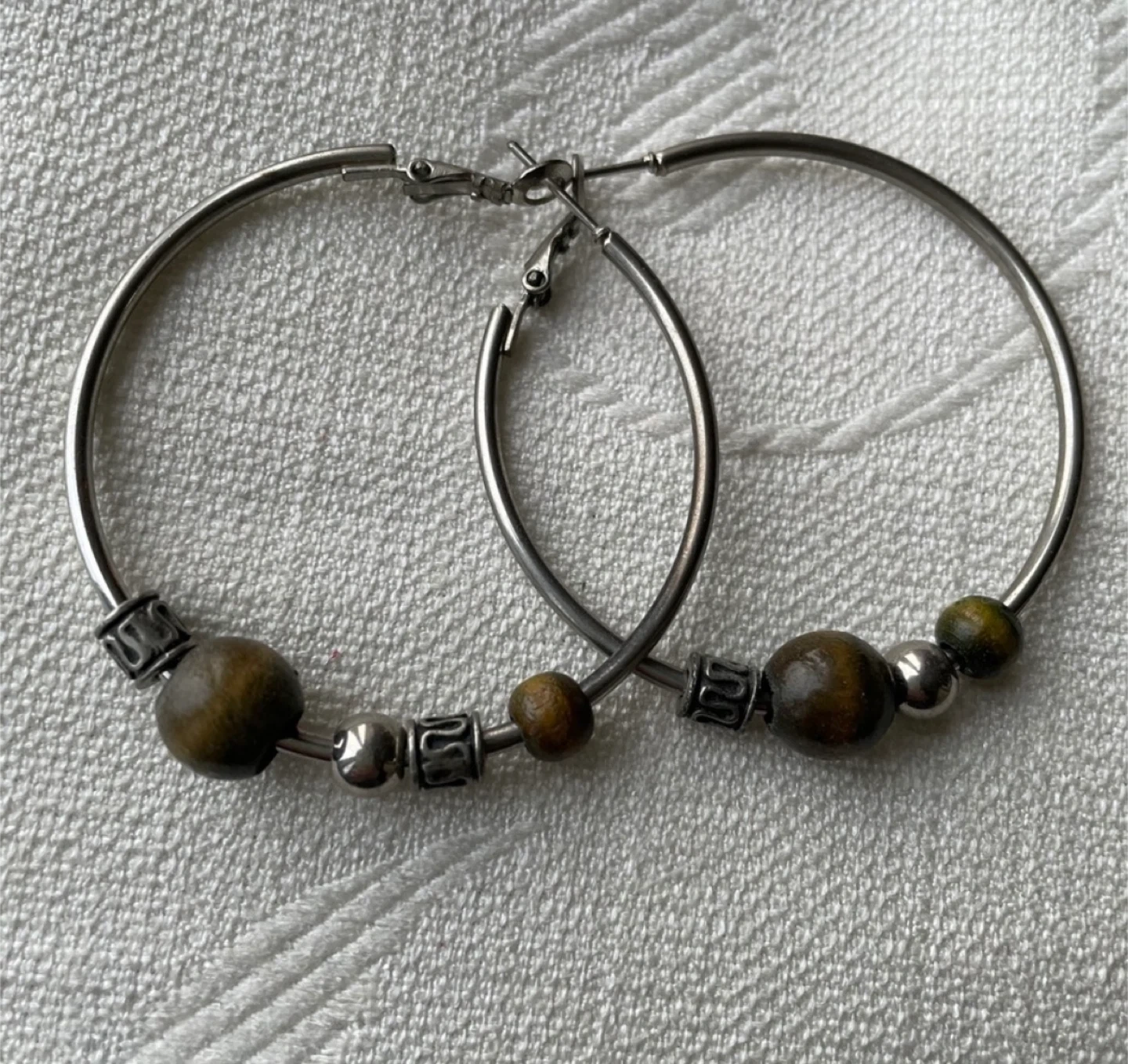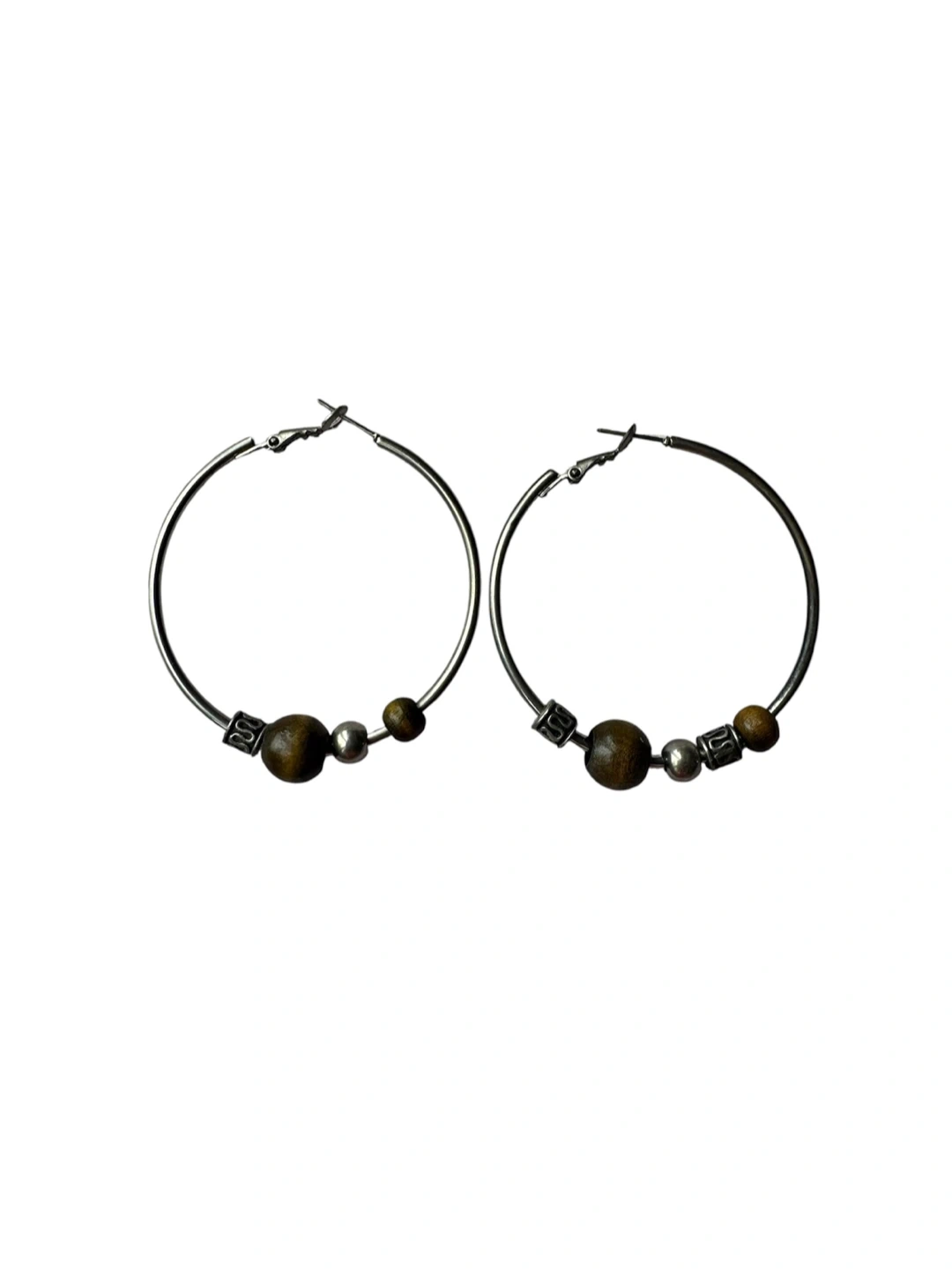 These are a pair of stylish silver hoop earrings. They feature wood beads and silver accents. A great addition to any outfit!
