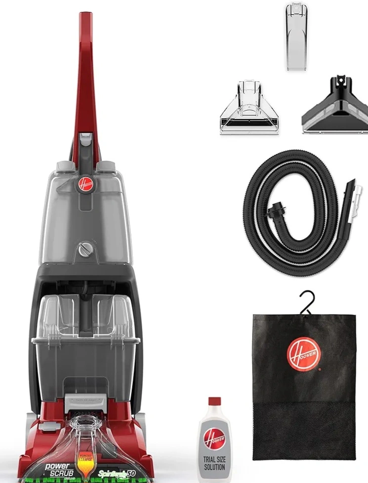 Selling a Hoover Power Scrub Deluxe carpet cleaner! It comes with all the attachments you see in the picture, including the hose, upholstery tool, and crevice tool. Also included is a trial size solution bottle and a storage bag for the attachments. It's in great condition and ready to help you keep your carpets clean