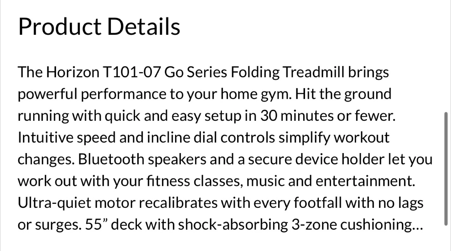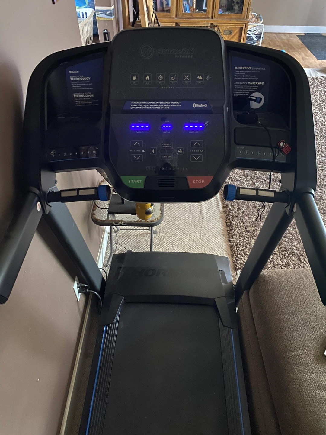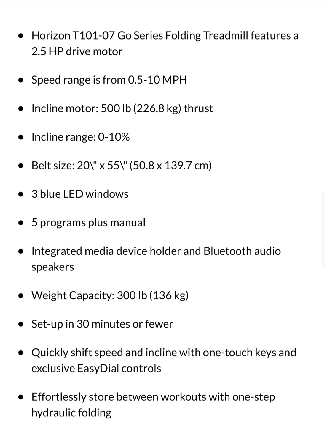Bought new for $999.99. Selling for $650.00. Pick up in Lamont. Will need to bring help. Open to offers. Selling a Horizon T101-07 Go Series Folding Treadmill. It features a 2.5 HP drive motor and a speed range from 0.5-10 MPH. The incline motor has 500 lb (226.8 kg) thrust, and the incline range is 0-10%. The belt size is 20\" x 55\" (50.8 x 139.7 cm). It also has integrated media device holder and Bluetooth audio speakers. The weight capacity is 300 lb (136 kg) and can be set-up in 30 minutes or fewer. Effortlessly store between workouts with one-step hydraulic folding