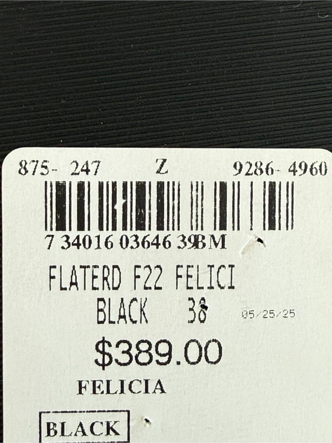 Selling a pair of Flattered Felicia boots in black, size 38. These stylish boots feature a lace-up design with a side zipper. The tag shows they originally retailed for $389.00. Perfect for adding a touch of chic to any outfit!