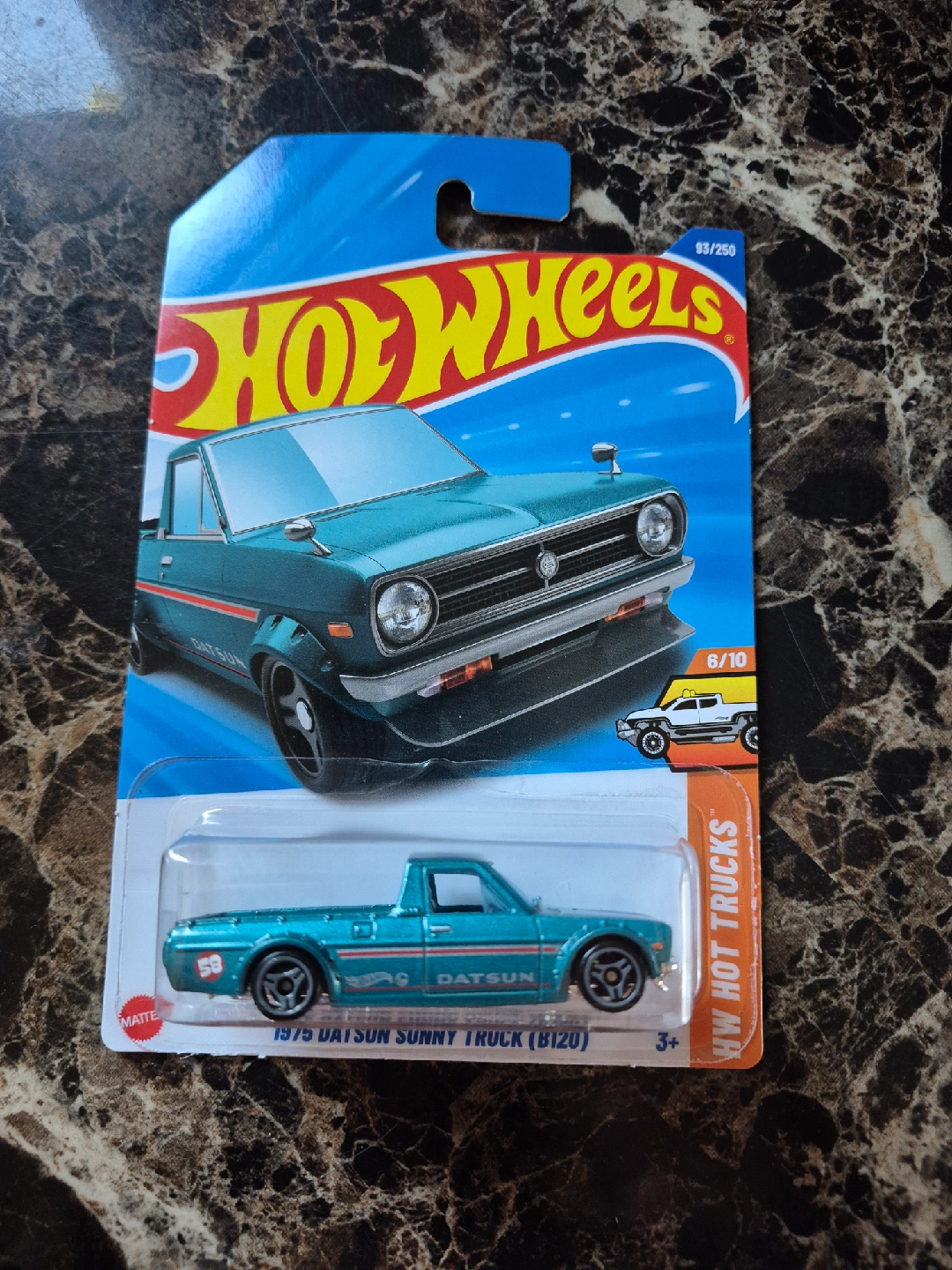 I'm selling a Hot Wheels 1975 Datsun Sunny Truck (B120). It's still in its original packaging and ready for a new home! The packaging indicates it's part of the HW Hot Trucks series and is number 6/10 in that set. It's recommended for ages 3+