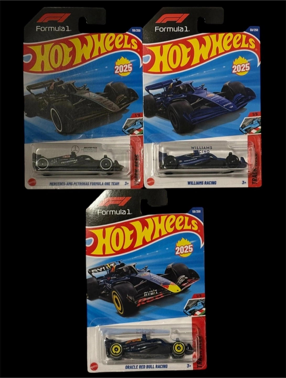 Selling three Hot Wheels Formula 1 cars: Mercedes-AMG Petronas, Williams Racing, and Oracle Red Bull Racing.