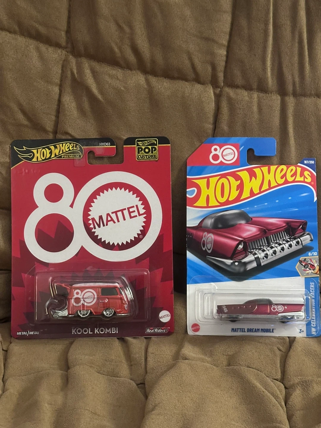 Selling two Hot Wheels cars celebrating Mattel's 80th anniversary! One is a Kool Kombi and the other is a Mattel Dream Mobile. Both are still in their original packaging and ready for a new home!