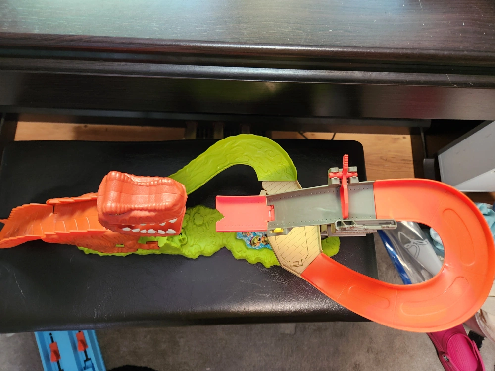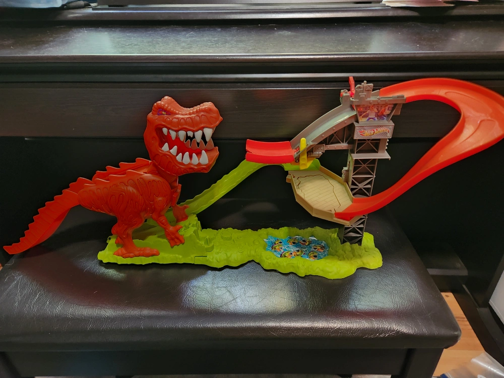 Selling a Hot Wheels T-Rex Rampage playset! This set features a large T-Rex figure and a ramp for launching cars. Hours of fun for any Hot Wheels fan! needs a replacement battery for noise and head movement