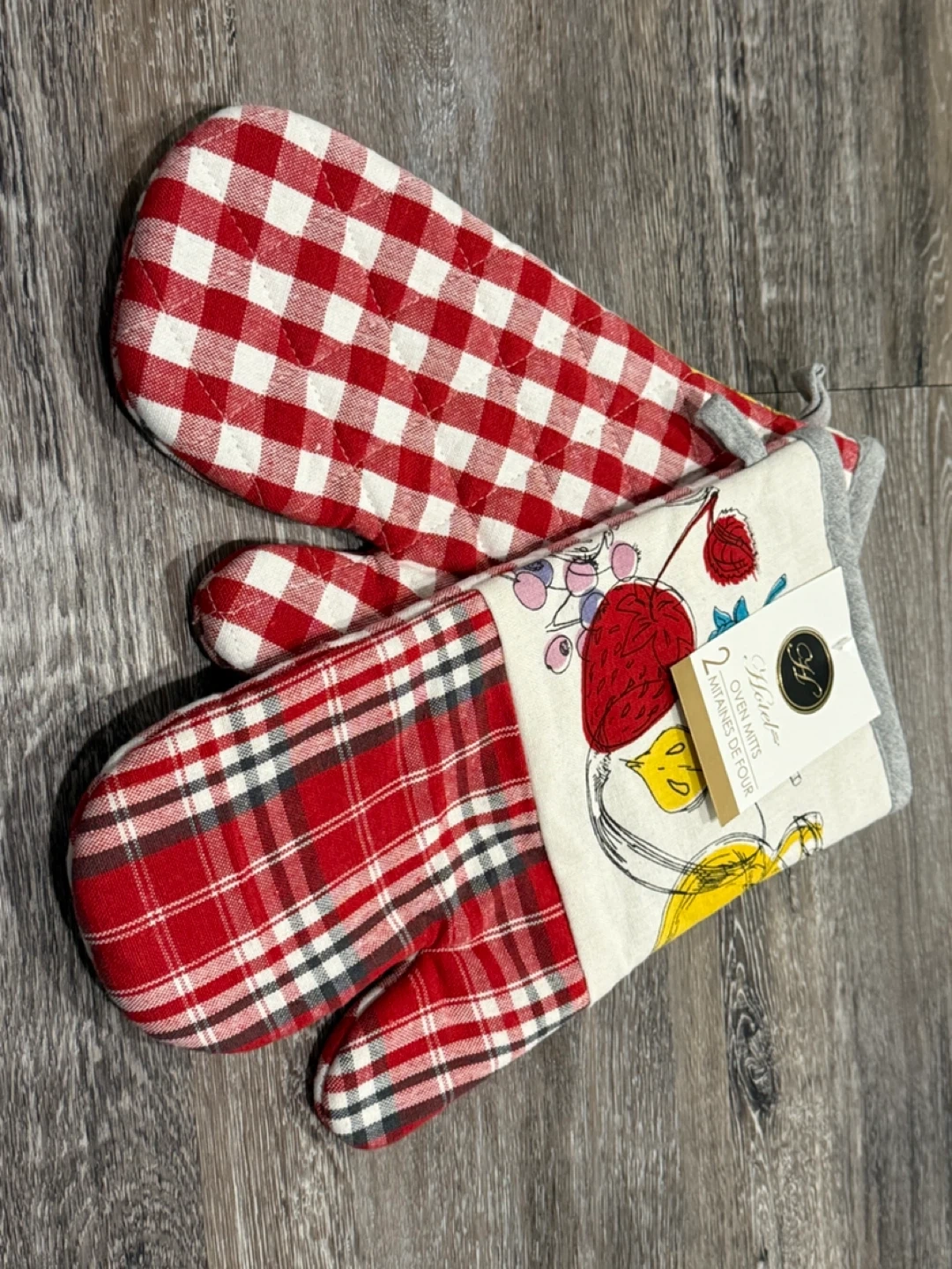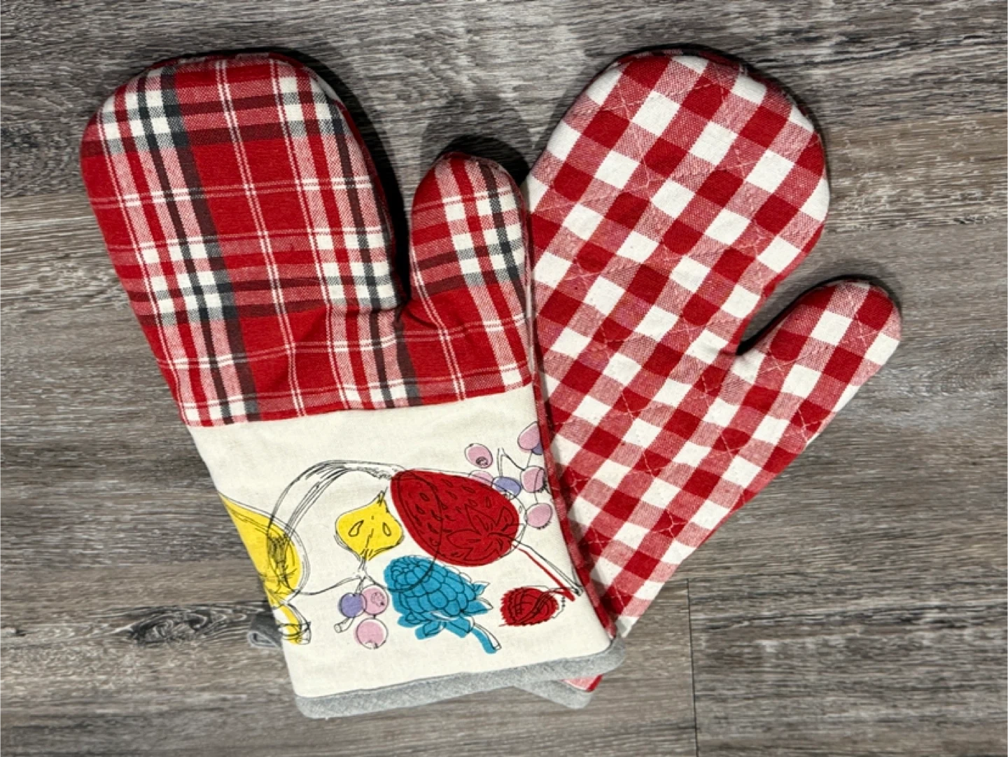 Selling a brand new pair of Hotel oven mitts! They're a cute addition to any kitchen, with a fruity design and red checkered pattern. Made of 80% cotton and 20% polyester for durability and heat resistance Pick up Sage Hill NW Cash only Check out my other listings Pet and smoke free home