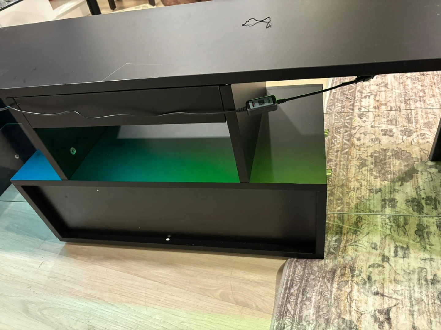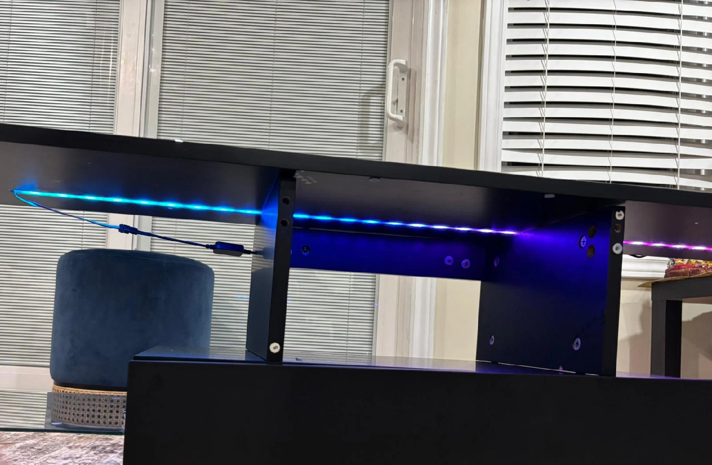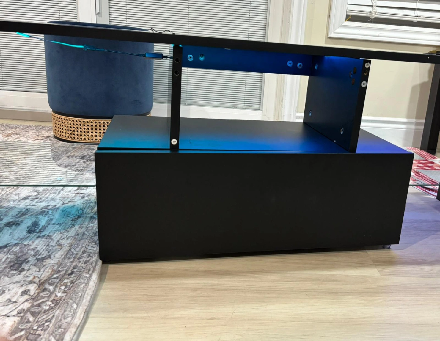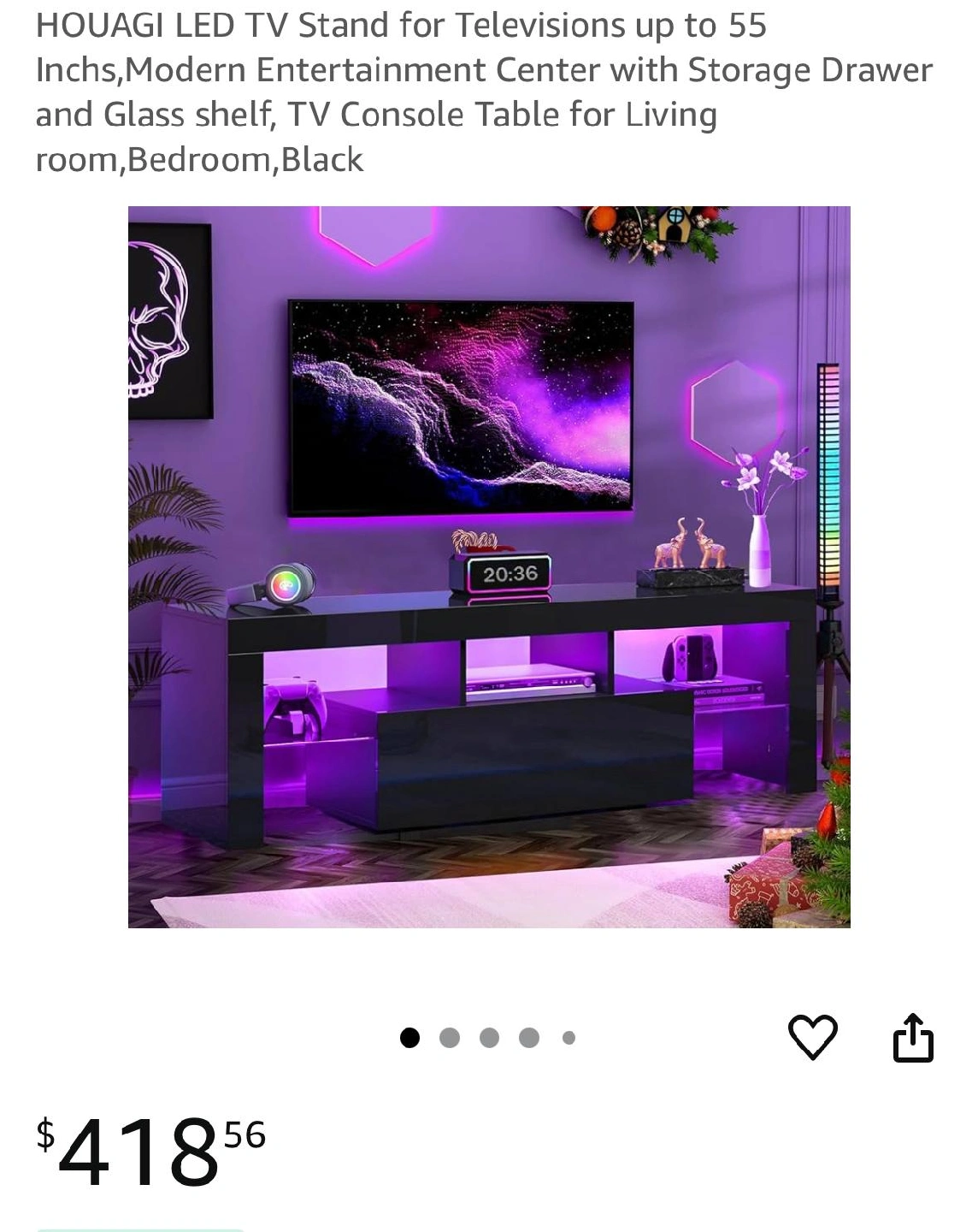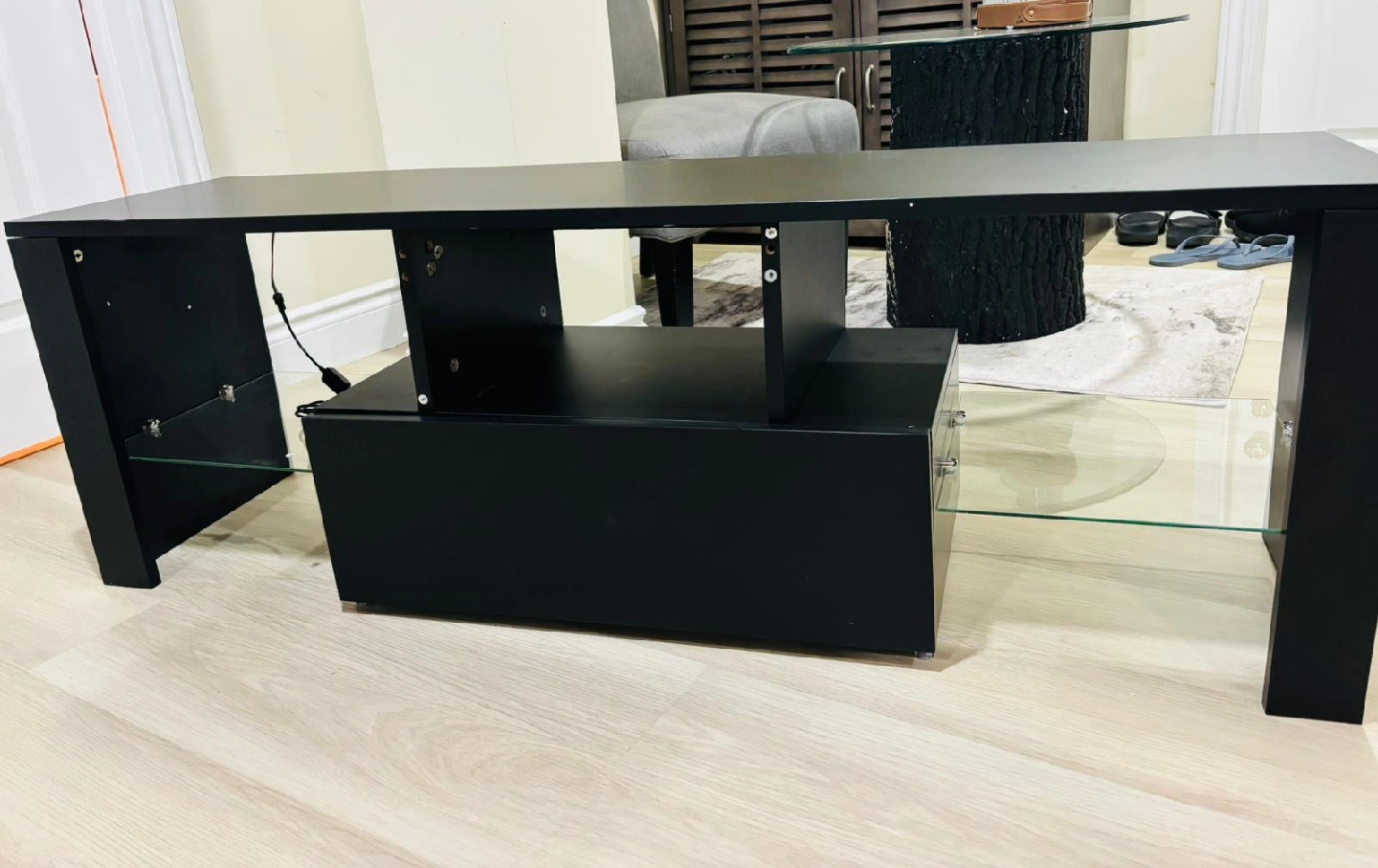 Selling a HOUAGI LED TV stand in black! It's perfect for TVs up to 55 inches. This modern entertainment center features a storage drawer and glass shelf, making it a stylish and functional addition to any living room or bedroom. Originally bought for $418.56