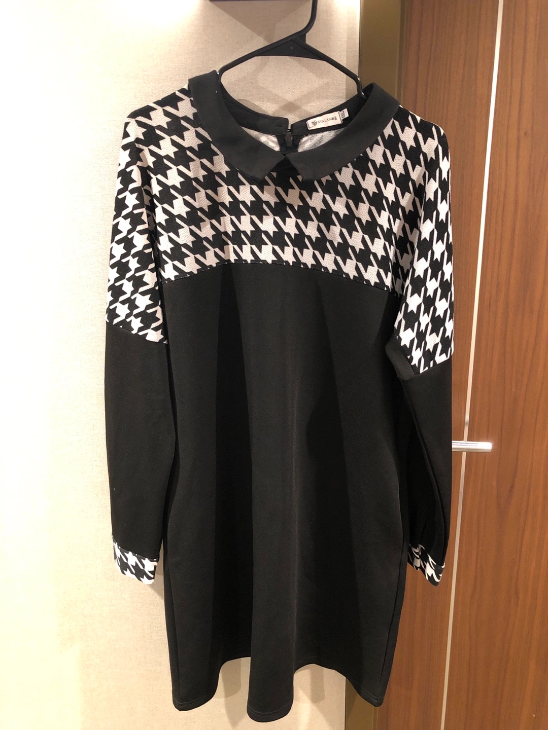 Long-sleeved dress with a collared neckline. Houndstooth pattern on the sleeves and collar. Black and white. Free shipping: If you spend more than 20 dollars in my list, you can get free shipping ( only in the old Toronto) Downtown pick up Cash only