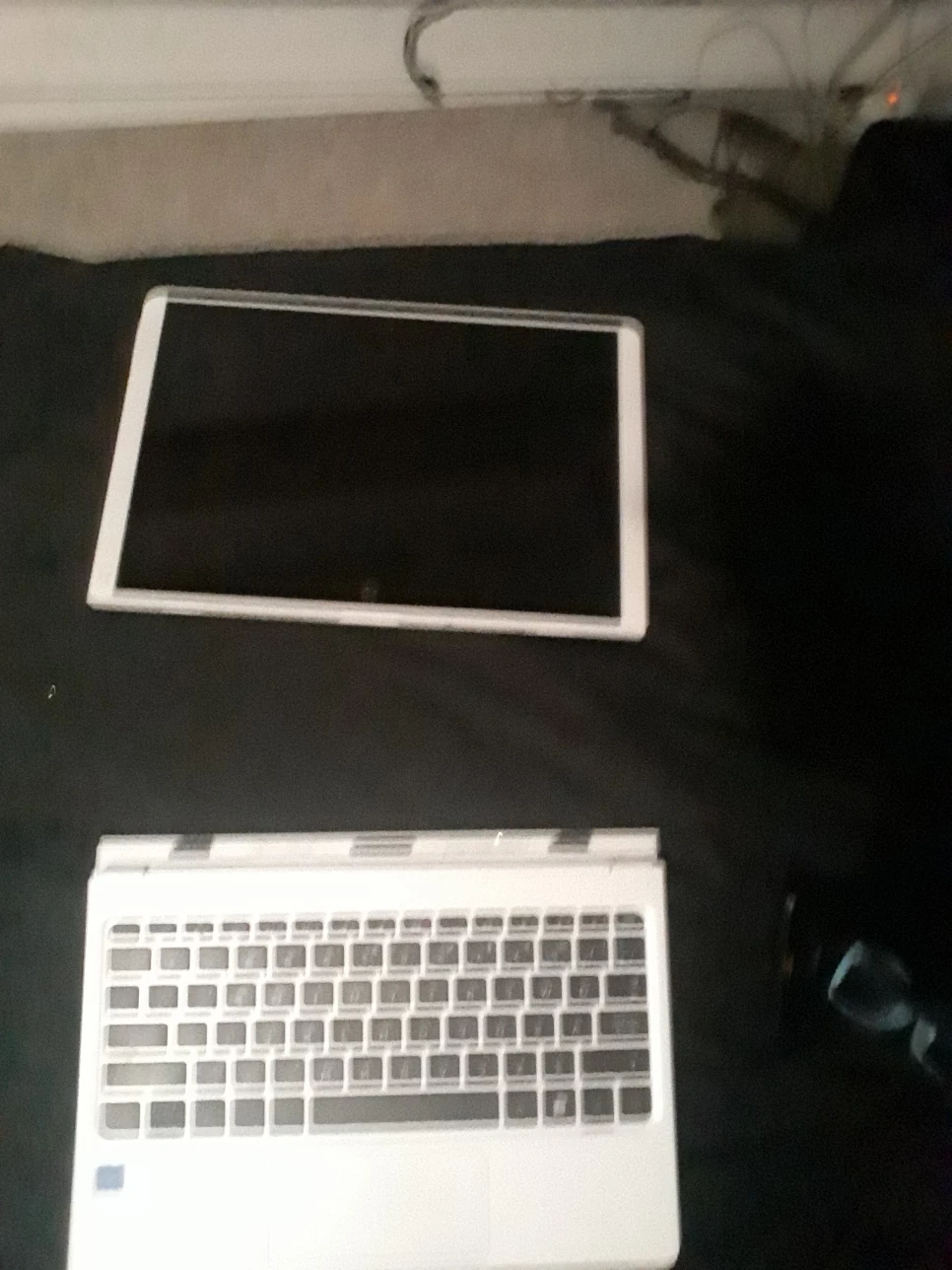 Selling a white HP laptop. It's in good condition and ready for a new home! Charges with C charging cord.