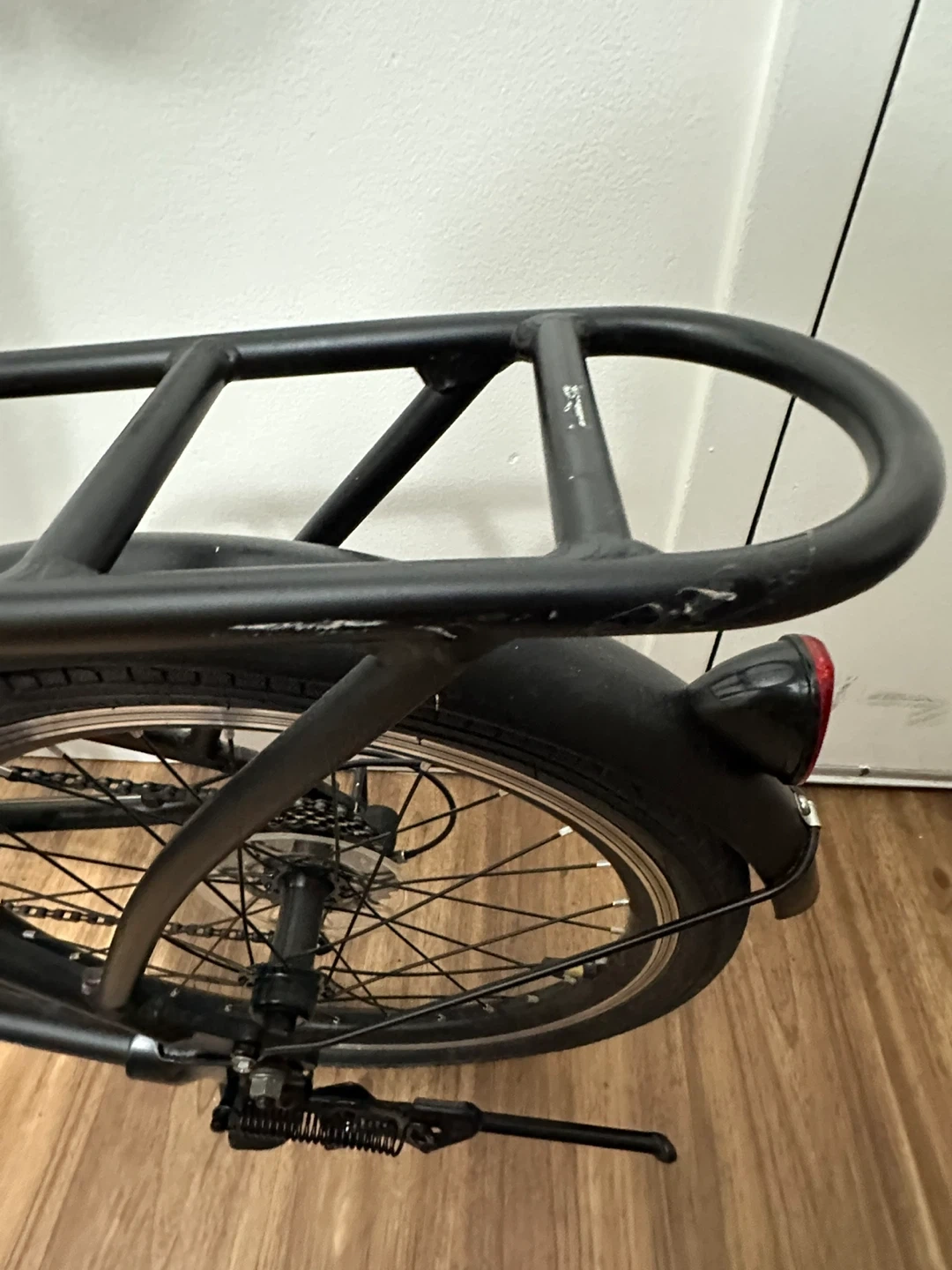 Selling a black Huffy folding bike. It's in good condition and perfect for commuting or storing in a small space. There are some signs of wear on the back rack.