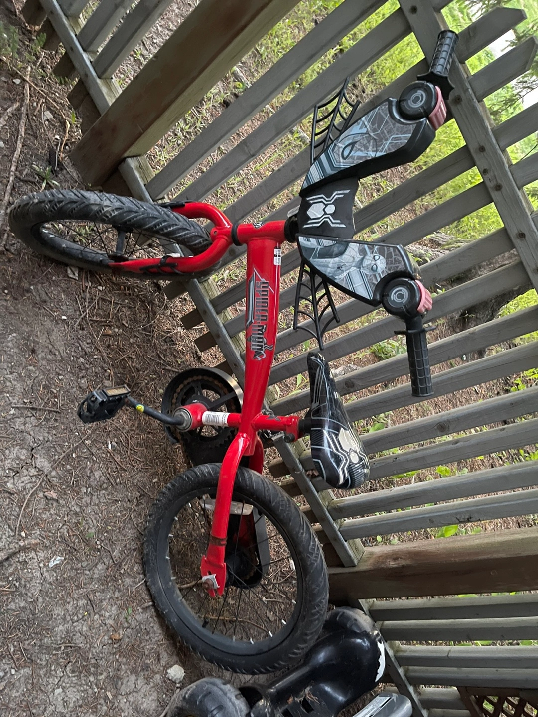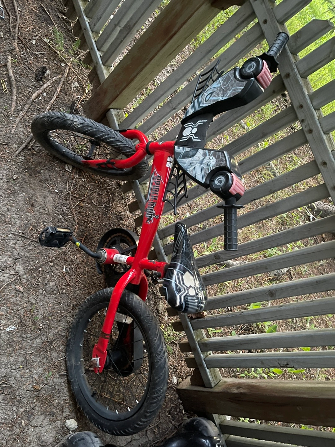 Here's a Huffy Marvel Spider-Man boys' bike! It's red and black and has Spider-Man designs on it. Great for young fans of the superhero!