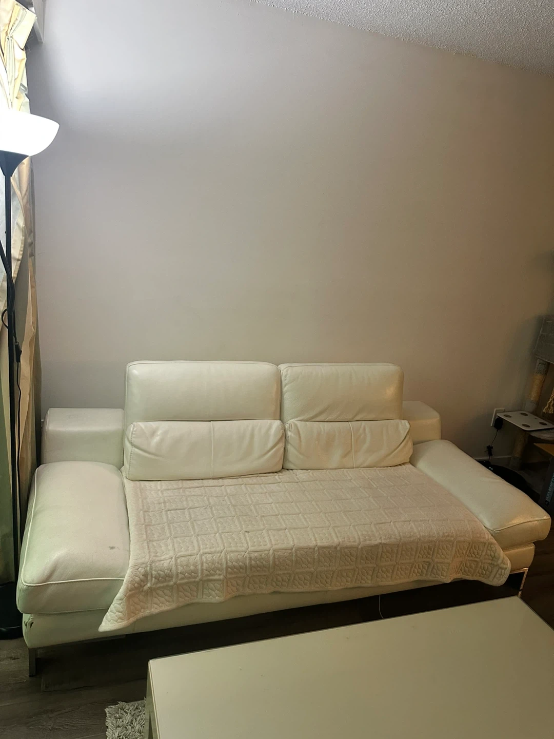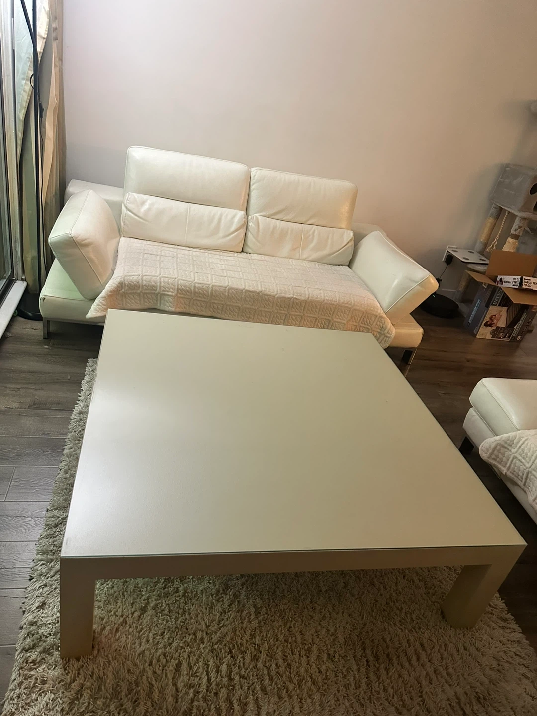 Huge coffee table whit a glass tabletop: Used - Good White Couch: Used - Good / It can be used as a sofa bed since it can be adjusted to different positions