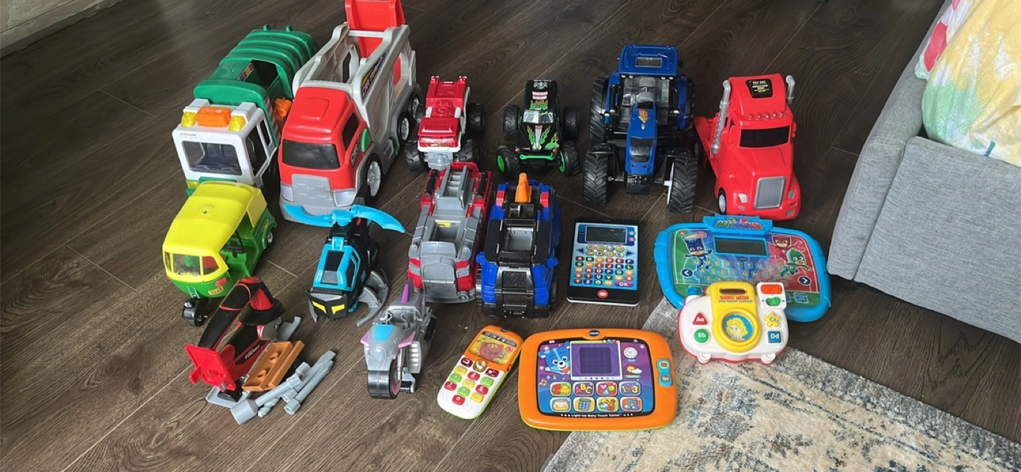 Large collection of children's toys. Includes various toy vehicles, monster trucks, a garbage truck, and construction vehicles. Plus, several electronic learning tablets for toddlers and preschoolers. Great for imaginative play and early learning.
