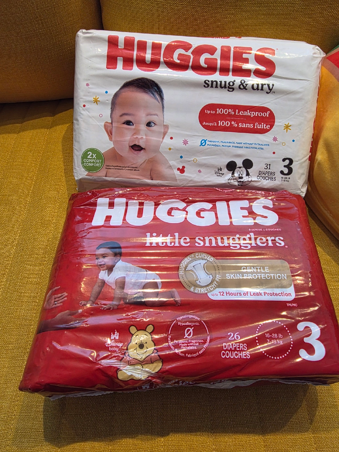 Selling two packs of Huggies diapers in size 3! One pack is Huggies Snug & Dry, and the other is Huggies Little Snugglers. Both are designed for gentle skin protection and up to 12 hours of leak protection. Perfect for your little one!