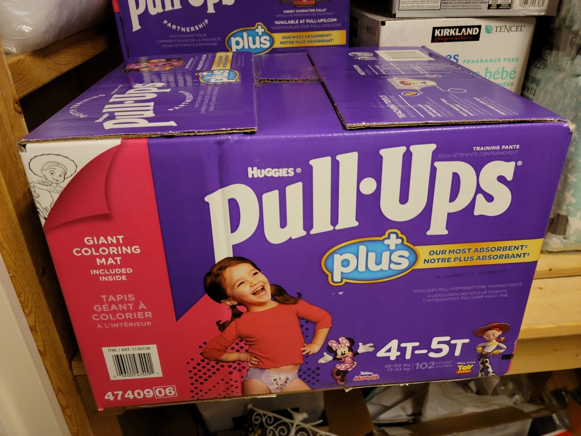 Selling a box of Huggies Pull-Ups Plus training pants in size 4T-5T, perfect for little ones weighing 38-50 lbs! The box contains 102 units. It also includes a giant coloring mat inside for extra fun! selling for $45 or 2 for $85 obo