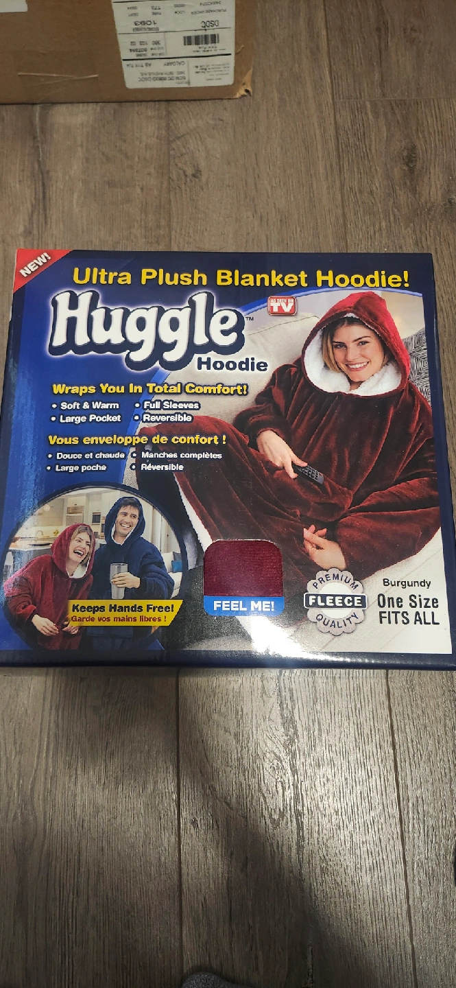 Stay cozy with this Huggle Hoodie! It's an ultra-plush blanket hoodie that wraps you in total comfort. It's soft and warm, with full sleeves, a large pocket, and is reversible. The colour is burgundy and it's one size fits all. Perfect for indoors or outdoors!