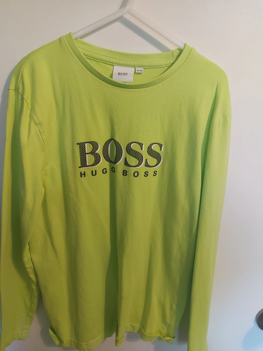Selling a Hugo Boss long-sleeve shirt in a vibrant lime green colour! It's in great condition and features the classic BOSS logo across the chest. Perfect for adding a pop of colour to your kid's wardrobe! Size 10