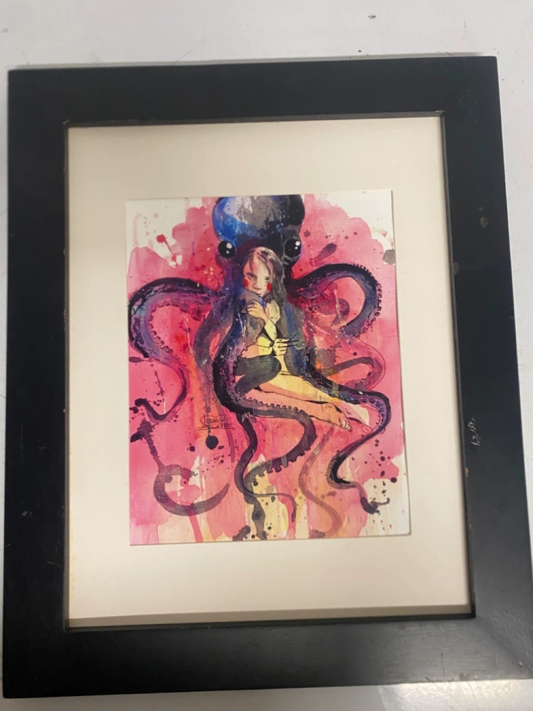 Hugs by Lora Zombie Watercolor Print. Great for adding a touch of unique sot after art to your space ! Has water mark damage on the prints edge unseen under the frames paper boarder and the frame has no glass.